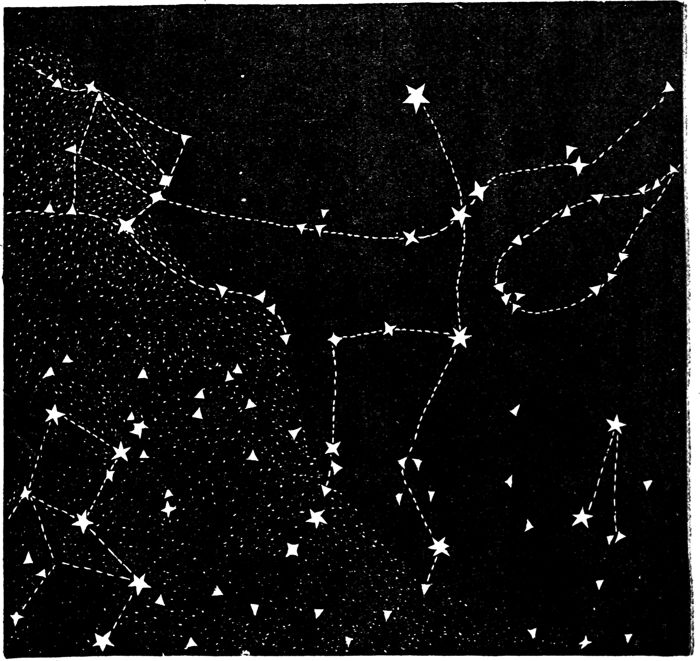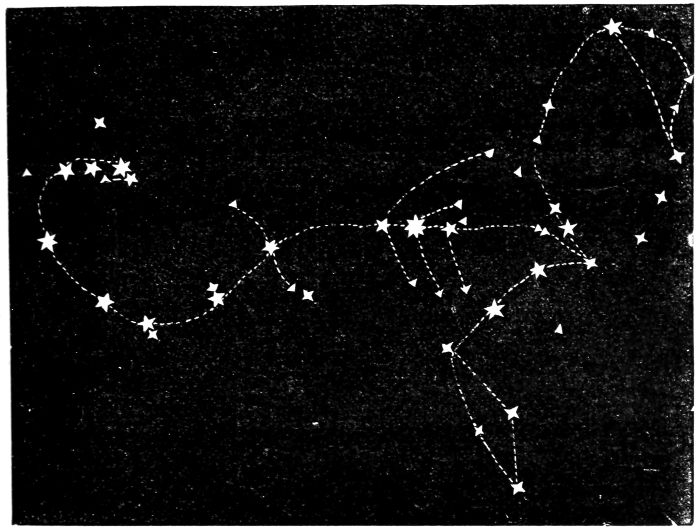 In the second place, the reader familiar with the constellations will perceive that several stars not at present appertaining to the Great Bear are included within the configuration itself of the animal in fig. 35. Thus the third magnitude star behind the right ear belongs to [251] the constellation of the Dragon; the third magnitude star near the hind quarters is Cor Caroli, the chief star of the modern constellation Canes Venatici, or the Hunting Dogs. It appears to me that we ought not to expect that the first observers of the heavens, in recognising imaginary features of resemblance between a group of stars and some known object, would be careful to inquire whether some among those stars were included in a group which they had compared or might afterwards compare with another object. It is very necessary for[252] the astronomer of our time, nay, it may have even been very necessary for the astronomers of the times of Hipparchus, Ptolemy, etc., to have the limits of the constellations clearly defined, and to let no conspicuous star be common to different constellations. But as regards the figures fancied in the heavens by the first observers of the stars, considerations of that sort would be of no importance whatever. Indeed, it is worthy of notice that even so late as the time of Bayer, who gave to the stars their Greek letters, the constellations were not separated from each other. He called the star now known as Beta Tauri only, Gamma Auriga also, so that now Auriga has stars Alpha, Beta, Delta, and so forth, but no Gamma. Similarly, we look in vain for any star Delta in the constellation Pegasus, simply because Bayer called one and the same star Alpha Andromedæ and Delta Pegasi, the astronomers of our own time retaining only the former name for this star,—the bright one adorning the head of Andromeda. Even in our time it has been found impossible properly to separate the older constellations from each other, so that to this day the Scorpion remains entangled with the legs of Ophiuchus, who is further inextricably mixed up with the Serpent. In fact, the Serpent is divided into two separate parts by the body of Ophiuchus, map-makers having no choice but either to allow Ophiuchus to divide the Serpent, or the Serpent to divide Ophiuchus.[253] [254] [255]