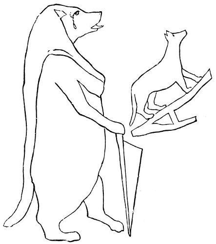 It will be noticed in the first place that the famous Septentriones (the seven stars of the Plough, as in England the set is called, the Dipper as it is called in America, the Corn-measurer as it was called by the ancient Chinese) has little or nothing to do with the configuration of the Bear, though forming a part of the constellation. It is the set of small stars forming the head which seems to have suggested the idea of a bear, though two of the paws are also well defined by the stars. But the outlining of the head of a bear or hippopotamus is really sufficiently close to require no very lively imagination to fill it in. Fig. 36, giving these stars only, serves to show this, I think. That the entire figure of a bear or hippopotamus was not recognised seems further shown by the figure assigned to the constellation in the Zodiac of Tentyra, or Denderah, where it appears as in fig. 37. The smaller figure is supposed to represent the Little Bear.
