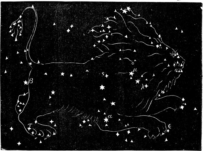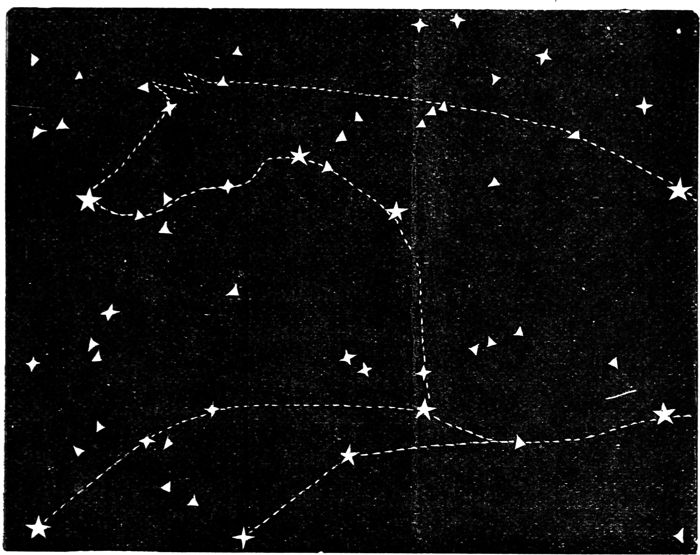 In the next case, that of the Great Lion, we have still further to depart from the modern configuration of the constellation. No one can imagine the remotest resemblance between any part of a lion and the grouping of stars falling on the corresponding portion of Leo in the modern constellation. The nose of the Lion now falls near λ (fig. 38); μ and ρ forming the outline of the mane, β the end of the tail, ε the nearer fore-paw, τ the nearer hind-paw. The original Lion, I cannot doubt, was imagined somewhat as pictured in fig. 38. The head and mane are unmistakably pictured among the stars, the paws fairly, the relatively small quarters and the tufted tail exceedingly well—always remembering that anything like very close resemblance is not to be looked for between a widely extended group of stars and the figure of an animal or other large object. If we remember also that uncultured nations, like children, are much quicker in imagining resemblances than those carefully trained to recognise the artistic delineation of objects, we cannot be surprised to find that nearly all those nations who were acquainted with the lion imagined a large leonine figure in the part of the heavens now centrally occupied by our modern and most puny Lion, but including portions of Cancer, the whole of Leo[256] Minor (one of Hevelius's absurd inventions), the Hair of Berenice, and a star or two belonging to Virgo.