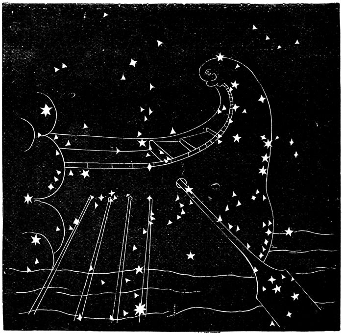 We have to treat in a similar way the constellation Argo of our present maps, to get the good ship Argo, as the ancients must have conceived the constellation. Fig. 39 shows the Ship as I imagine she was originally pictured. The stars which mark her curved poop belong[257] in part at present (as doubtless they have long belonged) to the Larger Dog, while those which mark the steering-oar belong to the modern constellation Columba Noachi, or Noah's Dove. It must be observed that the bright star Canopus, shown in the water, was not visible in the time of the first observers in the latitude where they probably dwelt. The mighty gyrating motion of the earth has caused these stars to be brought five or six degrees further from the southern pole of the heavens. But Canopus and a few of the small stars near it are the only stars which have thus been added to the constellation as seen from the regions inhabited by the first observers. (Canopus was known to the Arabian and Egyptian astronomers.)