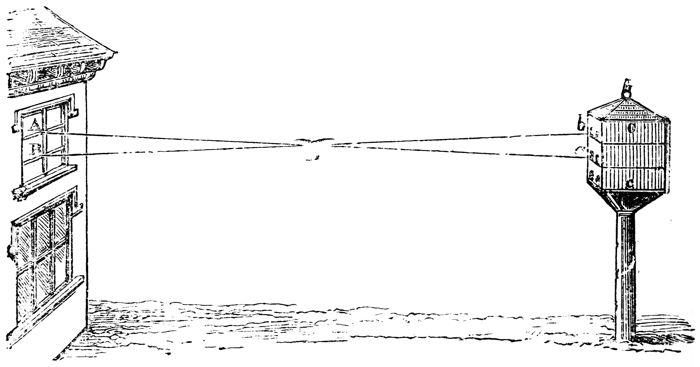 Suppose D, fig. 42, to be a dove flying between the window A B and the dovecot C c, and let us suppose that a person looking at the dove just over the bar A sees her apparently cross the cot at the level a, at the foot of one row of openings, while another person looking at the dove just over the bar B sees her cross the cot apparently at the level b, at the foot of the row of openings next above the row a. Now suppose that the observer does not know the distance or size of the cot, but that he does know in some way that the[276] dove flies just midway between the window and the cot; then it is perfectly clear that the distance a b between the two rows of openings is exactly the same as the distance A B between the two window-bars; so that our observers need only measure A B with a foot-rule to know the scale on which the dovecot is made. If A B is one foot, for instance, then a b is also one foot; and if the dovecot has three equal divisions, as shown at the side, then C c is exactly one yard in height.
