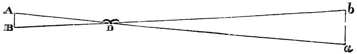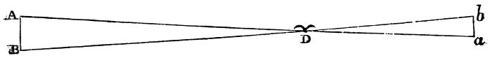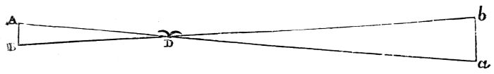 Thus, if D a is twice as great as D A, as in fig. 43, then a b is twice as great as A B, the length which the observers know; and if D a is only equal to half D A, as in fig. 44, then a b is only equal to half the known length A B. In every possible case the length of a b is known. Take one other case in which the proportion is not quite so simple:—Suppose that D a is greater than D A in the proportion of 18 to 7, as in fig. 45; then b a is greater than A B in the same proportion; so that, for instance, if A B is a length of 7 inches, b a is a length of 18 inches.
