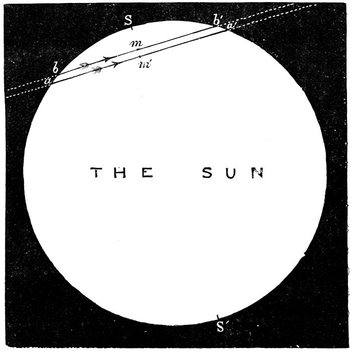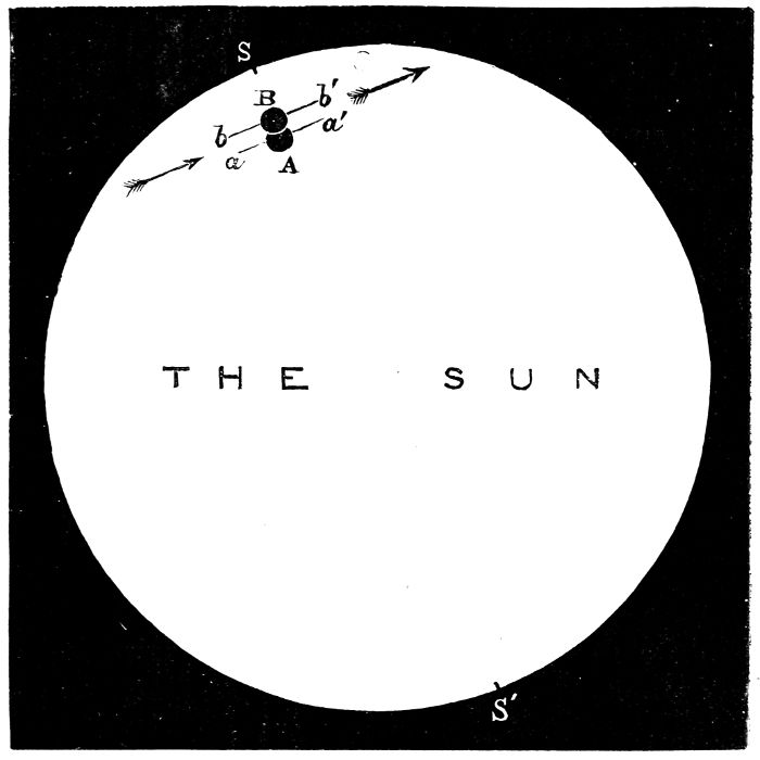 For, first, the observers would be several thousand miles apart. How then are they to ensure that their observations shall be made simultaneously? Again, the distance a b is really a very minute quantity, and a very slight mistake in observation would cause a very great mistake in the measurement of the sun's distance. Accordingly, Halley devised a plan by which one observer in the north (or as at A, fig. 47) would watch [285] Venus as she traversed the sun's face along a lower path, as a a´ fig. 49; while another in the south (or as at B, fig. 47) would watch her as she traversed a higher path, as b b´ fig. 49. By timing her they could tell how long these paths were, and therefore how placed on the sun's face, as in fig. 49; that is, how far apart, which is the same thing as determining b a, fig. 48. This was Halley's plan, and as it requires that the duration of the transit[286] should be timed, it is called the method of durations. Delisle proposed another method—viz., that one observer should time the exact moment when Venus, seen from one station, began to traverse the path a a´, while another should time the exact moment when she began to traverse the path b b´; this would show how much b is in advance of a, and thence the position of the two paths can be determined. Or two observers might note the end of the transit, thus finding how much a´ is in advance of b´ This is Delisle's method, and it has this advantage over Halley's—that an observer is only required to see either the beginning or the end of the transit, not both.
