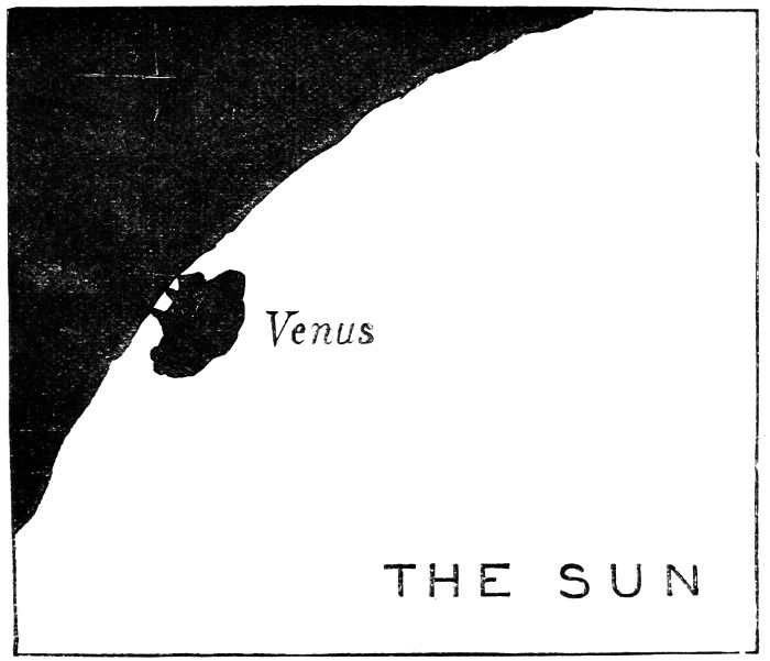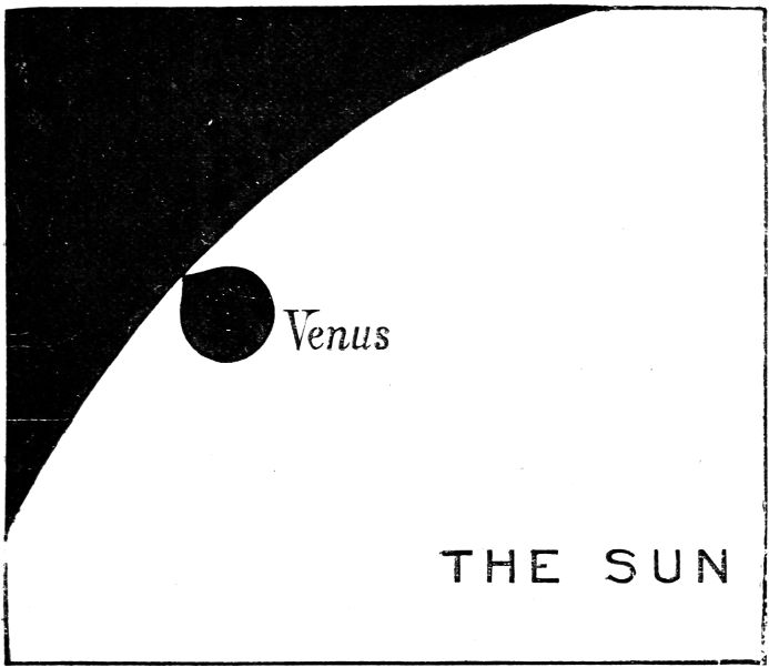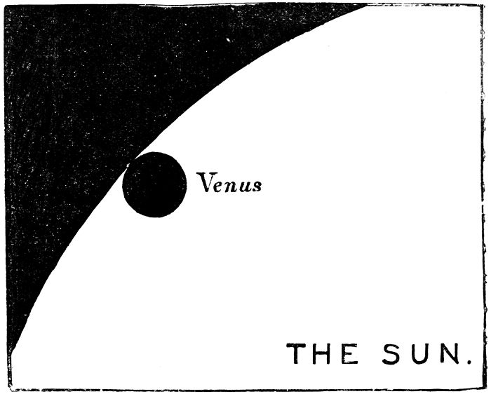 Of course it is known that a transit of Venus is the apparent passage of the planet across the face of the sun, when, in passing between the earth and sun, as she does about eight times in thirteen years, she chances to come so close to the imaginary line joining the centres of those bodies that, as seen from the earth, she appears to be upon the face of the sun. We may compare her to a dove circling round a dovecot, and coming once in each circuit between an observer and her house. If in[274] her circuit she flew now higher, now lower, or, in other words, if the plane of her path were somewhat aslant, she would appear to pass sometimes above the cot, and sometimes below it, but from time to time she would seem to fly right across it. So Venus, in circuiting round the sun, appears sometimes, when she comes between us and the sun, to pass above his face, and sometimes to pass below it; but occasionally passes right across it. In such a case she is said to transit the sun's disc, and the phenomenon is called a transit of Venus. She has a companion in these circuiting motions, the planet Mercury, though this planet travels much nearer to the sun. It is as though, while a dove were flying around a dovecot at a distance of several yards, a sparrow were circling round the cot at a little more than half the distance, flying a good deal more quickly. It will be understood that Mercury also crosses the face of the sun from time to time—in fact, a great deal oftener than Venus; but, for a reason presently to be explained, the transits of Mercury are of no great importance in astronomy. One occurred in 1861, another in 1868; another in May, 1878; yet very little attention was paid to those events; and before the next transit of Venus, in 1882, there will be a transit of Mercury, in November, 1881; yet no arrangements have been made for observing Mercury in transit on these occasions;[275] whereas astronomers began to lay their plans for observing the transit of Venus in 1882, as far back as 1857.