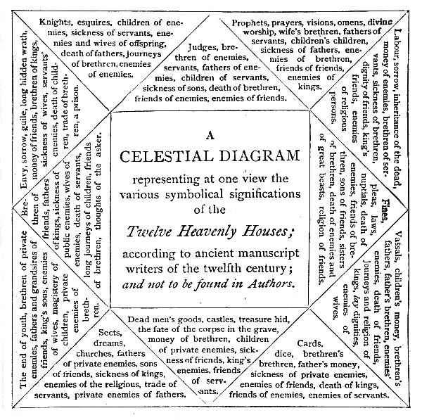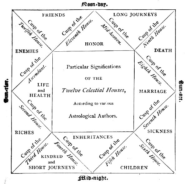 The first, called the Ascendant House, was the portion rising above the horizon at the east. It was regarded as the House of Life, the planets located therein at the moment of birth having most potent influence on the life and destiny of the native. Such planets were said to rule the ascendant, being in the ascending house; and it is from this usage that our familiar expression that such and such an influence is 'in the ascendant' is derived. The next house was the House of Riches, and was one-third of the way from the east below the horizon towards the place of the sun at midnight. The third was the House of Kindred,[Pg 20] short journeys, letters, messages, etc. It was two-thirds of the way towards the place of the midnight sun. The fourth was the House of Parents, and was the house which the sun reached at midnight. The fifth was the House of Children and Women, also of all sorts of amusements, theatres, banquets, and merry-making. The sixth was the House of Sickness. The seventh was the House of Love and Marriage. These three houses (the fifth, sixth, and seventh) followed in order from the fourth, so as to correspond to the part of the sun's path below the horizon, between his place at midnight and his place when descending in the west. The seventh, opposite to the first, was the Descendant. The eighth house was the first house above the horizon, lying to the west, and was the House of Death. The ninth house, next to the mid-heaven on the west, was the House of Religion, science, learning, books, and long voyages. The tenth, which was in the mid-heaven, or region occupied by the sun at midday, was the House of Honour, denoting credit, renown, profession or calling, trade, preferment, etc. The eleventh house, next to the mid-heaven on the east, was the House of Friends. Lastly, the twelfth house was the House of Enemies.