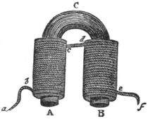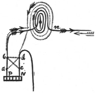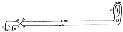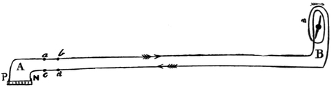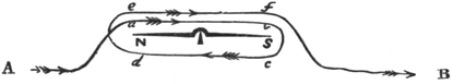 30 I must caution the reader against Fig. 348 in Guillemin’s Application of the Physical Forces, in which the part c d of the wire is not shown. The two coils are in reality part of a single coil, divided into two to permit of the bar being bent; and to remove the part c d is to divide the wire, and, of course, break the current. It will be seen that c d passes from the remote side of coil b c, Fig. 6, to the near side of coil d e. If it were taken round the remote side of the latter coil, the current along this would neutralize the effect of the current along the other.