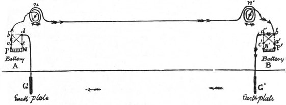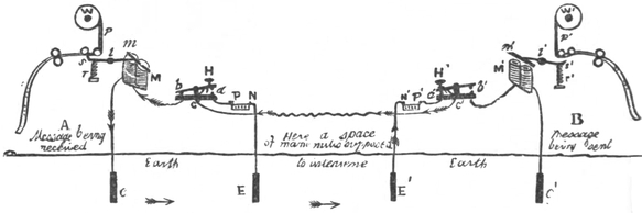 33 It is to be noticed, however, that the recording pointer must always mark its lines in the same direction, so that, unless a message is being transmitted at the same time that one is being received (in which case the oscillations both ways are utilized), the instrument works only during one-half of each complete double oscillation.