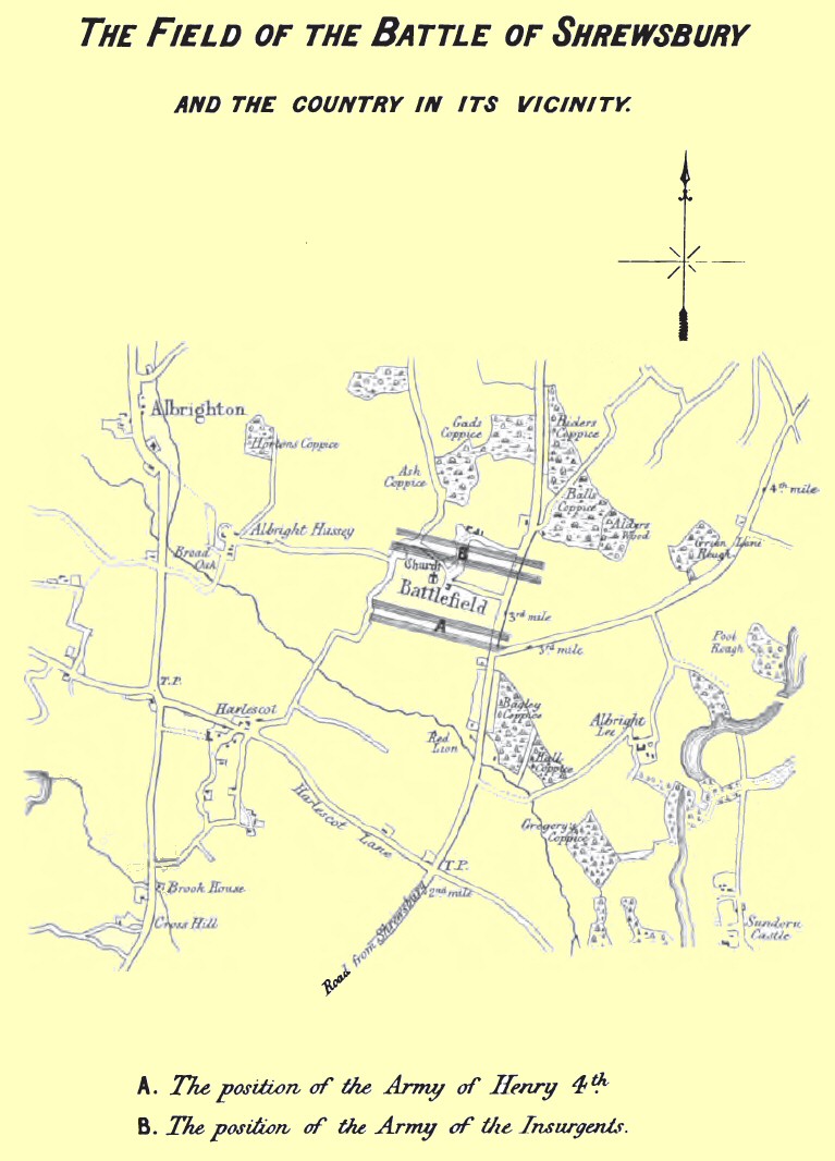 Not any of the old annalists or chroniclers give us information as to the exact line of march, which Percy and his forces pursued from the north into Shropshire. From the circumstance of the confederates being stated to have issued a proclamation, p. 4in which they asserted that Richard II. was alive at Chester, [4a] and invited his partisans to meet in arms in that city; [4a] and from the reinforcements which the confederates obtained from Cheshire, it might perhaps be inferred that they entered Staffordshire from Cheshire, by the Whitchurch and Prees road; but on the other hand, if Percy marched, as we are told he did, with his army to Stafford, and was there joined by the Earl of Worcester [4b] and his forces, it is tolerably clear that the insurgent army must have entered Shropshire on its eastward side, in marching towards Shrewsbury; and it has been suggested, with much appearance of probability, that they entered the county through Newport, by High Ercall and Haghmond Hill. [4c] In either case, it is certain that they advanced to Shrewsbury, and arrived there some time on the 19th of July, but too late to get possession of the town; and in marching from the north (as the river encompasses the town nearly on three sides), it is tolerably certain, that they advanced in order to attack it at the north or Castle Gate. Henry IV. had assembled an army against the Welsh, and was with it at Burton-upon-Trent, when he heard of the confederates’ hostile movements; and by the Earl of Dunbar’s advice, immediately marched towards Shrewsbury. He was at Burton-upon-Trent on the 16th of July, [4d] and on the 17th at Lichfield, [4e] from whence he would probably take the Watling Street Road, and after arriving at Shrewsbury, he would naturally enter it over the Abbey Bridge. [4f] He succeeded in getting possession of the town a few hours before Percy’s arrival, who is said to have reached the Castle Foregate on the evening of July 19th. This judicious course was of the p. 5utmost importance to the success of Henry’s cause, as by it he secured the passage of the Severn, and prevented Owen Glendowr, who had advanced with his forces to Oswestry, from crossing the river and effecting a junction with Percy. Henry had scarcely entered Shrewsbury, when he was apprized by his scouts that the confederate forces, with banners displayed, were advancing towards him, and were so courageous and bold, that their light cavalry had begun to skirmish with his troops; upon which he marched out, and encamped without the east gate of the town, [5a] and offered battle to his enemies. [5b]