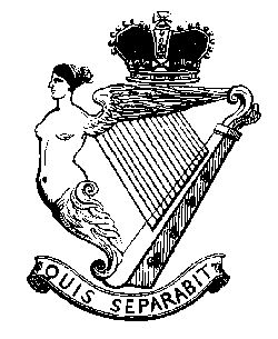 In the spring of this year, His Majesty, King William IV., was graciously pleased to approve of the regiment bearing on its colours and appointments the Irish “Harp and Crown” and the motto “Quis Separabit?”. The harp and crown only was assumed when the corps obtained the title of Royal County Down Regiment.