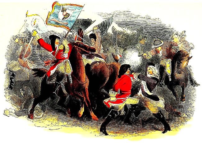 [13] The Honourable William Ponsonby, (son of Lord Ponsonby,) after holding the commissions of ensign in Captain Bulwer's independent company, lieutenant in Captain Davis's independent company, and captain in the eighty-third regiment, was appointed major in the Loyal Irish Fencibles, in December, 1794: in March, 1798 he was removed to the majority of the Fifth Dragoon Guards, and he served with his regiment in Ireland during the rebellion, which broke out in the following summer. On the 1st of January, 1800, he was promoted to the rank of lieutenant-colonel in the army; in February, 1803, he was appointed lieutenant-colonel, in the Fifth Dragoon Guards; and on the 25th of July, 1810, he was advanced to the brevet rank of colonel. He commanded the six troops of the Fifth Dragoon Guards on foreign service in 1811, and 1812, and while at the theatre of war he was so conspicuous for a gallant and chivalrous spirit, with cheerful alacrity in moments of peril and privation, united with a kind and benevolent disposition, that he won the affection and esteem of those individuals who had the happiness of becoming acquainted with him, and he was the favourite of the troopers of his regiment. At the battle of Salamanca he led the Fifth Dragoon Guards to the charge with his characteristic zeal and gallantry; after the fall of Major-General Le Marchant he was appointed to the command of the heavy brigade, which he held until the end of the war; and no officer better qualified for that important trust, or one who possessed the confidence of the officers and men in a greater degree, could have been found in the army. He was promoted to the rank of major-general on the 4th of June, 1813; and was afterwards chosen a knight commander of the honourable military order of the Bath. On the recommencement of hostilities in 1815, this distinguished officer was placed on the staff of the army in Belgium, and appointed to the command of the second cavalry brigade, consisting of the Royal, Scots Greys, and Inniskilling dragoons, which corps he led to the charge of the French infantry at the battle of Waterloo with that intrepidity for which he had always been so eminently distinguished. Having cut through the first column, he continued his career against fresh adversaries; while passing through a newly-ploughed field, which was so soft and miry from recent heavy rain that his charger sunk deeply in the soil at every step and became exhausted, he was attacked by a regiment of Polish lancers; being in front of his brigade, no one was near him except one aide-de-camp, and at the moment when his horse was unable to extricate itself, a body of lancers approached him at full speed. His own death he knew was inevitable; but supposing his aide-de-camp might escape, he drew from his bosom the picture of his lady, and was in the act of delivering it and his watch to his attendant, to be conveyed to his wife and family, when the lancers came up, and they were both speared on the spot. Thus fell the brave, the ingenuous Ponsonby, whose death occasioned deep sorrow in the Fifth Dragoon Guards, and the troopers expressed regret that they were not at Waterloo to revenge the death of their former commander, who had led them to battle and to victory. His death is thus alluded to by the Duke of Wellington in his public despatch. "I have received a report that Major-General Sir William Ponsonby is killed; and in announcing this intelligence I have to add the expression of my grief for the fate of an officer who had already rendered very brilliant and important services, and was an ornament to his profession."