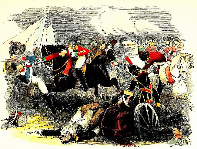 "Nor were these valiant swordsmen yet exhausted. Their own general, Le Marchant, and many officers had fallen, but Cotton and all his staff were at their head, and with ranks confused, and blended together in one mass, still galloping forward they sustained from a fresh column an irregular stream of fire which emptied a hundred saddles; yet with fine courage, and downright force, the survivors broke through this the third and strongest body of men that had encountered them, and Lord Edward Somerset, continuing his course at the head of one squadron, with a happy perseverance, captured five guns. The French left was entirely broken, more than two thousand prisoners were taken, the French light horsemen abandoned that part of the field, and Thomiere's division no longer existed as a military body. Anson's cavalry, which had passed quite over the hill, and had suffered little in the charge, was now joined by D'Urban's troopers, and took the place of Le Marchant's exhausted men; the heavy German dragoons followed in reserve, and with the third and fifth divisions and the guns formed one formidable line two miles in advance of where Pakenham first attacked, and that impetuous officer with unmitigated strength still pressed forward spreading terror and disorder on the enemy's left."