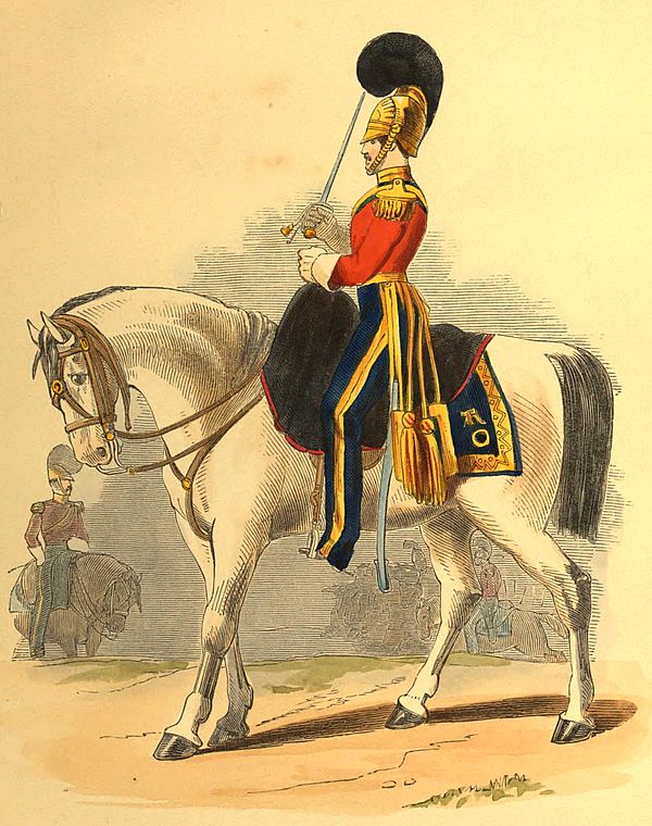 At present there are only three Regiments which are styled Horse in the British Army,[vii] namely, the two Regiments of Life Guards, and the Royal Regiment of Horse Guards, to whom cuirasses have recently been restored. The other Cavalry Regiments consist of Dragoon Guards, Heavy and Light Dragoons, Hussars, and Lancers; and although the long musket and bayonet have been laid aside by the whole of the Cavalry, and the Regiments are armed and equipped on the principle of the old Horse (excepting the cuirass), they continue to be styled Dragoons.