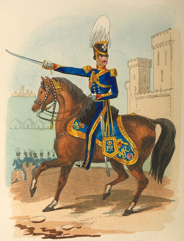 At present there are only three Regiments which are styled Horse in the British Army, namely, the two Regiments of Life Guards, and the Royal Regiment of Horse Guards, to whom cuirasses have recently been restored. The other Cavalry Regiments consist of Dragoon Guards Heavy and Light Dragoons, Hussars, and Lancers; and although the long musket and bayonet have been laid aside by the whole of the Cavalry, and the Regiments are armed and equipped on the principle of the old Horse (excepting the cuirass), they continue to be styled Dragoons.