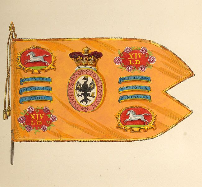 At this period the old Cavalry Regiments rode black horses (excepting the Scots Greys) with docked tails; but the Duke of Kingston's Regiment was mounted on light horses of various colours, with swish or nag tails. The accoutrements were as light as possible: the men carried short carbines slung to their sides by a moveable swivel, pistols, and light swords inclined to a curve.