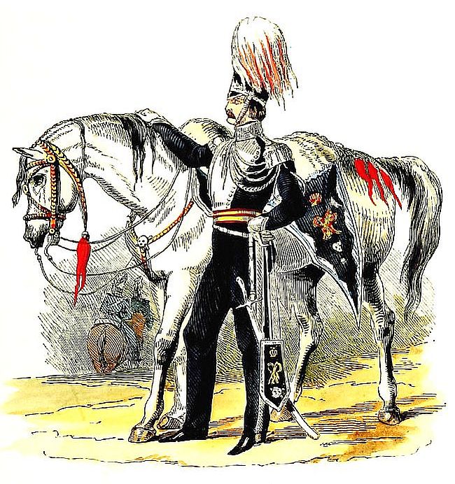 In May, 1830, the head-quarters proceeded to Newbridge; and soon after the accession of King William IV., on the 26th of June, the regiment was directed to wear scarlet clothing, with yellow lace, and blue trowsers; and to discontinue the moustaches.
