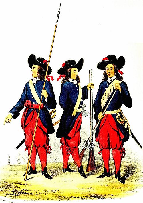 King William III. incorporated the Admiral's regiment in the Second Foot Guards, and raised two Marine regiments for sea-service. During the war in this reign, each company of infantry (excepting the fusiliers and grenadiers) consisted of 14 pikemen and 46 musketeers; the captains carried pikes; lieutenants, partisans; ensigns, half-pikes; and serjeants, halberds. After the peace in 1697 the Marine regiments were disbanded, but were again formed on the breaking out of the war in 1702.[2]
