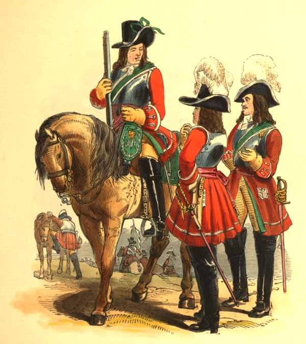 The formation of the present Army commenced[iii] after the Restoration in 1660, with the establishment of regular corps of Horse and Foot; the Horsemen were cuirassiers, but only wore armour on the head and body; and the Foot were pikemen and musketeers. The arms which each description of force carried, are described in the following extract from the "Regulations of King Charles II.," dated 5th May, 1663:—