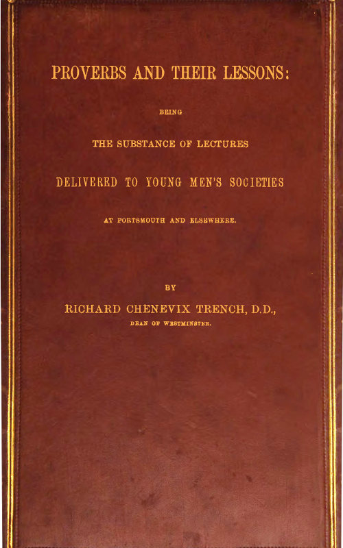 It may be as well to state, that the lectures which are here published were never delivered as a complete course, but only one here and two there, as matter gradually grew under my hands; yet so that very much the greater part of what is contained in this volume has been at one time or another actually delivered. Although I have always taken a lively interest in national proverbs, I had no intention at the first of making a book about them; but only selected the subject as one which I thought, though I was not confident of this, might afford me sufficient material for a single lecture, which I had undertaken some time ago to deliver. I confess that I was at the time almost entirely ignorant of the immense number and variety of books bearing on the subject. Many of these I still know only by name. With some of the best, however, I have made myself acquainted, and by their aid, with the addition of such further material as I could myself furnish, these lectures have assumed their present shape; and I publish them, because none of the works on proverbs[iv] which I know are exactly that book for all readers which I could have wished to see. Either they include matter which cannot be fitly placed before all—or they address themselves to the scholar alone, or if not so, are at any rate inaccessible to the mere English reader—or they contain bare lists of proverbs, with no endeavour to compare, illustrate, and explain them—or if they seek to explain, yet they do it without attempting to sound the depths, or measure the real significance, of that which they undertake to unfold. From these or other causes it has come to pass, that with a multitude of books, many of them admirable, on a subject so popular, there is no single one which is frequent in the hands of men. I will not deny that, with all the slightness and shortcomings of my own, I have still hoped to supply, at least for the present, this deficiency.