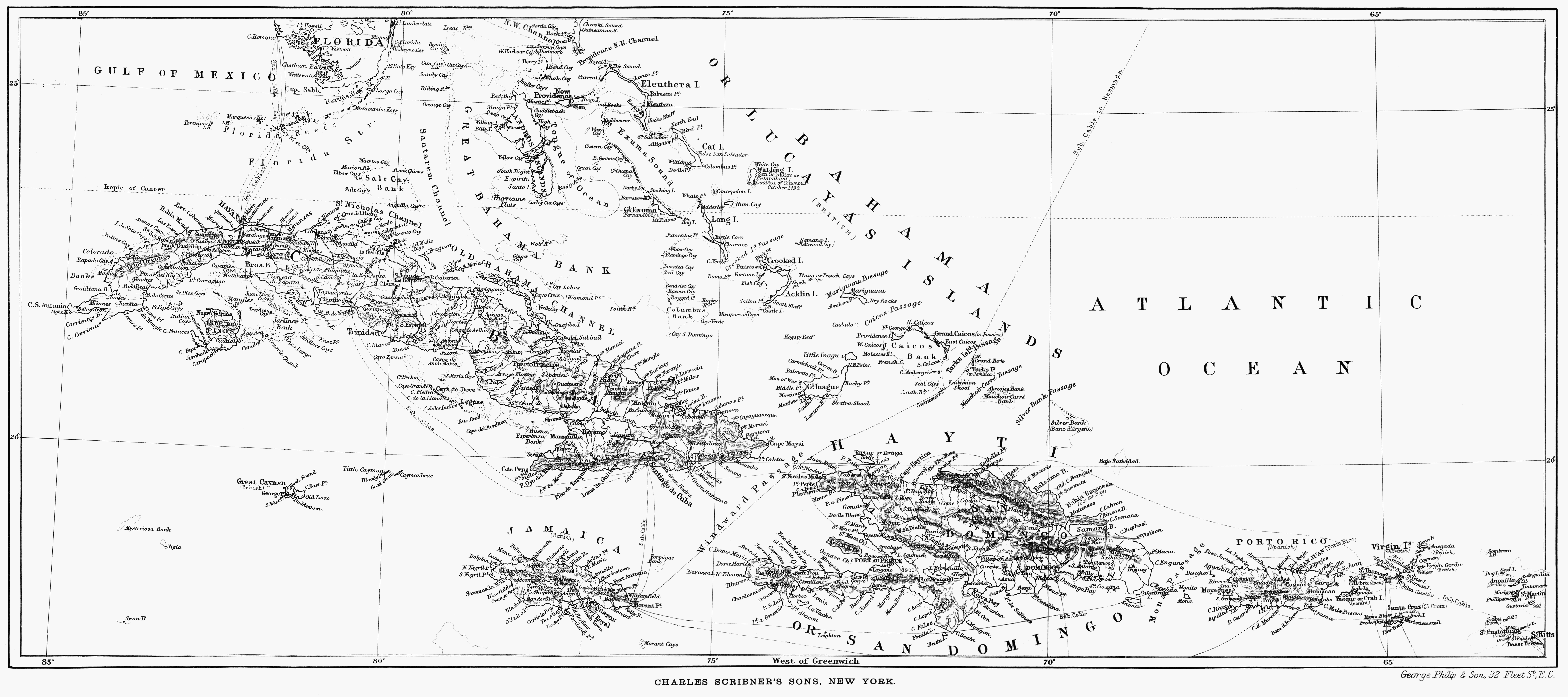 [1] The island of Cuba lies between the Caribbean Sea on the S., and the Gulf of Mexico, the Gulf of Florida, and Bahama Channel on the N., being nearly equidistant from the peninsulas of Yucatan and Florida and the islands of Hayti and Jamaica. It stretches in N. lat. from 19° 50' to 23° 9', and in W. long. from 74° 8' to 84° 158'. The rainfall at Havana is said to be 92.68 inches, or more than double that of the opposite coast of Florida. The atmospheric tendencies are less violent than in the other islands. Hurricanes are frequent, but not so terrible as elsewhere in the same zone. However, one of them, in October 1846, destroyed a third of Havana, while hundreds were killed and thousands injured. The north wind blows with more or less strength throughout the entire winter months. In summer, when the sun is at its zenith, torrential rains, lasting for days at a time, are frequent. Hail is rare, but, once or twice in this century, snow has fallen on the upper plateaus of the Sierra Maestra. According to the proverbial "oldest inhabitant," the rainfall has considerably diminished of late years through the burning down of some of the forests in the central district of the island. It has also been observed that in the past twenty-five years the rainy season begins much later than it did in the good old times—in June instead of April; and ends earlier—in July instead of in October.
