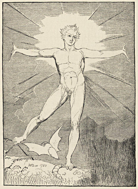 At the age of fourteen Blake was apprenticed to the engraver Basire. Ryland had been thought of, but Blake, according to a story which he must have narrated, but may not improbably have imagined, demurred, declaring that the fashionable engraver looked as if he would one day be hanged, as he actually was. Basire’s practice lay chiefly in engraving antiquities, and the last five years of Blake’s apprenticeship were chiefly spent in drawing tombs and architectural details in Westminster Abbey a most advantageous discipline, which imbued his mind with the Gothic spirit, an influence already in the air, evincing itself in Götz von Berlichingens, Rowley Poems, Percy Relics, and Castles of Otranto; and, by directing him to English history and Shakespeare, powerfully[9] stimulated and felicitously guided the poetical genius of which he was shortly to give proof. He drew, Malkin tells us, the monuments of kings and queens in every point of view he could catch, frequently standing on them. The heads he considered as portraits, and all the ornaments appeared as miracles of art to his Gothicised imagination. Nor could a better environment for a mystic be desired than the venerable and generally solitary temple, “the height, the space, the gloom, the glory,” with its music, its memories, and its constant sense of the presence of the dead. The bent of his mind at the time is shown by his first engraving, Joseph of Arimathea among the Rocks of Albion, copied, as he states, from a scarce Italian print. If this was indeed the case, it may be queried whether the title at least was not his—Joseph, according to the legend, having been the first missionary to Britain. The original, if original there was, certainly was not the work of Michael Angelo, to whom Blake chose to attribute it. Scarcely was he out of his articles than he produced (1779) two engravings from the history of England, The Penance of Jane Shore and King Edward and Queen Eleanor. These were after two water-colour drawings, selected from a much greater number with which he had amused the leisure hours of his apprenticeship. Mr. Gilchrist says that these and other works of the period have little of the peculiar Blakean quality, except the striking design Morning, or Glad Day, dated 1780, a facsimile of which is given here. This, indeed, is Blake all over, and would have made an excellent frontispiece for the poems with which he was about to herald the dawn of a new era in English poetry, though in all probability designed as an illustration of the lines in Romeo and Juliet;
