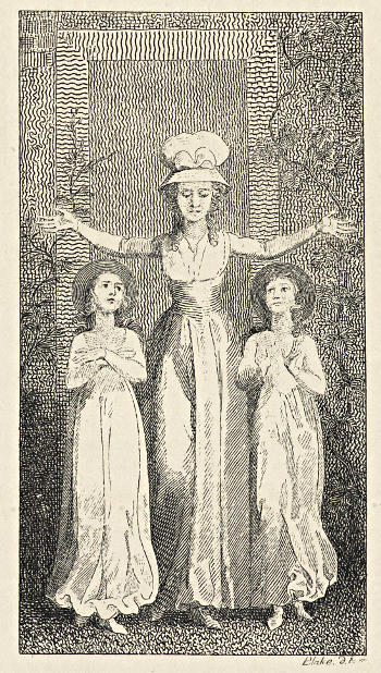 Both the simplicity and the melody, however, are absent from the remarkable works with which Blake had been occupying himself during the interval between the publication of the two series of his songs, which, with their successors, have given him a peculiar and unique reputation in their own weird way, but could not by themselves have given him the reputation of a poet. Blake’s plain prose, as we shall see, is much more effective. In a strictly artistic point of view, nevertheless, these compositions reveal higher capacities than would have been inferred from the idyllic beauty of the pictorial accompaniments of Songs of Innocence and Experience. Before discussing these it will be convenient to relate the chief circumstances of Blake’s life during the period of their production, and up to the remarkable episode of his migration to Felpham. They were not memorable or striking, but one of them had considerable influence upon his development. In 1791 he was employed by Johnson, the Liberal publisher of St. Paul’s Churchyard, and as such a minor light of his time, to illustrate Mary Wollstonecraft’s Tales for Children with six plates, both designed and engraved by him, one of which accompanies this essay. They are much in the manner of Stothard. This commission brought Blake as a guest to Johnson’s house, where he became acquainted with a republican coterie—Mary Wollstonecraft, Godwin, Paine, Holcroft, Fuseli—with whose political opinions he harmonised well, though totally dissimilar in temperament from all of them, except Fuseli, who gave him several tokens of interest and friendship. These acquaintanceships, and the excitement of the times, led Blake to indite, and, which is more extraordinary, Johnson to publish, the first of an intended series of seven poetical books on the French Revolution. This, Gilchrist tells us, was a thin quarto, without illustrations, published without Blake’s name, and priced at a shilling. Gilchrist probably derived this information from a catalogue, for he carefully avoids claiming to have seen the book, which seems to have also escaped the researches of all Blake’s other biographers. It must be feared that it is entirely lost. Gilchrist must, however, have known something more of it if his assertion that the other six books[28] were actually written but not printed, “events taking a different turn from the anticipated one,” is based upon anything besides conjecture.