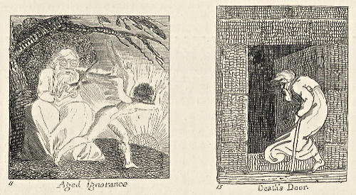 The total effect of this process is tersely expressed by Mr. Rossetti, “The art is made to permeate the poetry.” It resulted in the publication of Songs of Innocence in 1789, two years after its discovery or revelation. Other productions, of that weird and symbolic character in which Blake came more and more to delight, followed in quick succession. These will claim copious notice, but for the present we may pass on to Songs of Experience, produced in 1794, so much of a companion volume to Songs of Innocence that the two are usually found within the same cover. Neither attracted much attention at the time. Charles Lamb says: “I have heard of his poems, but have never seen them.” He is, however, acquainted with “Tiger, tiger,” which he pronounces “glorious.” The price of the two sets when issued together was from thirty shillings to two guineas—an illustration of the material service which Art can render[21] to Poetry when it is considered that, published simply as poems, they would in that age have found no purchasers at eighteenpence. This price was nevertheless absurdly below their real value, and was enhanced even during the artist’s lifetime. It came to be five guineas, and late in his life friends, from the munificent Sir Thomas Lawrence downwards, would commission sets tinted by himself at from ten to twenty guineas as a veiled charity.