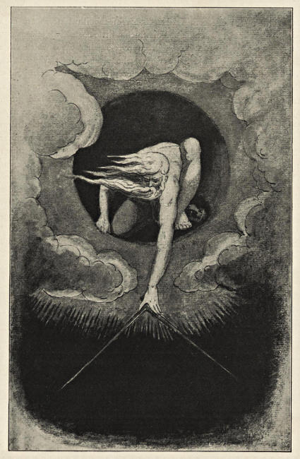 The Ancient of Days setting a Compass to the Earth. From a water-colour drawing by W. Blake. British Museum.