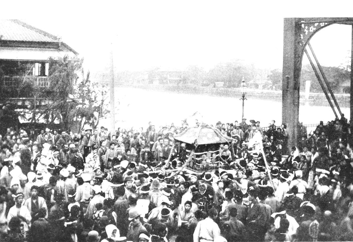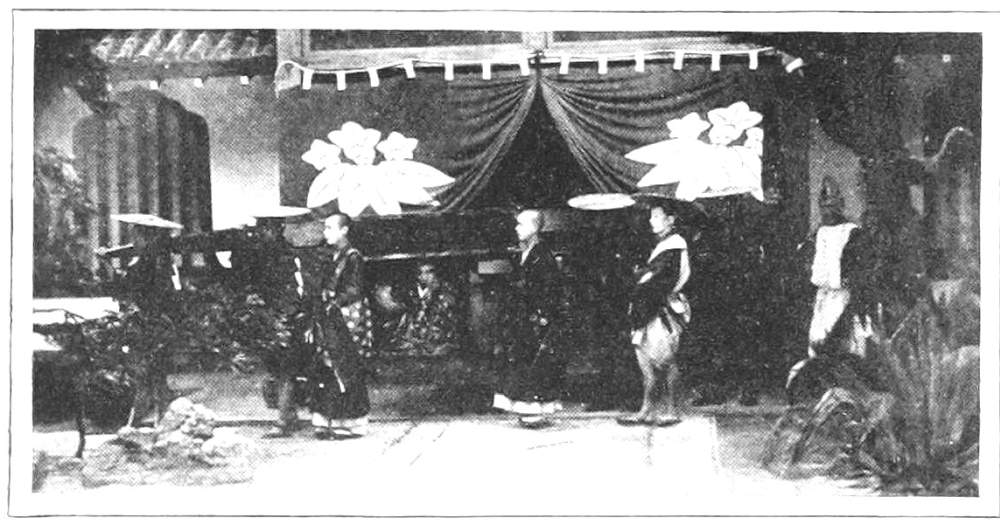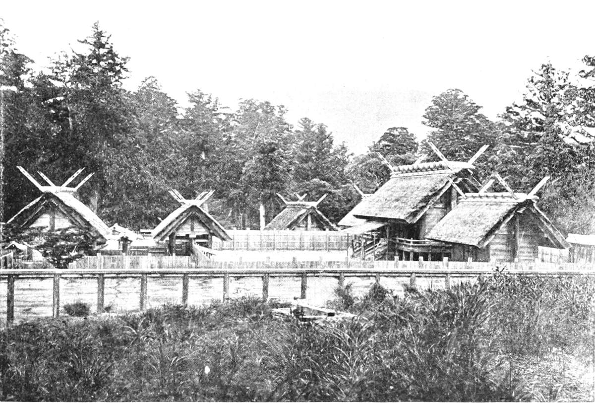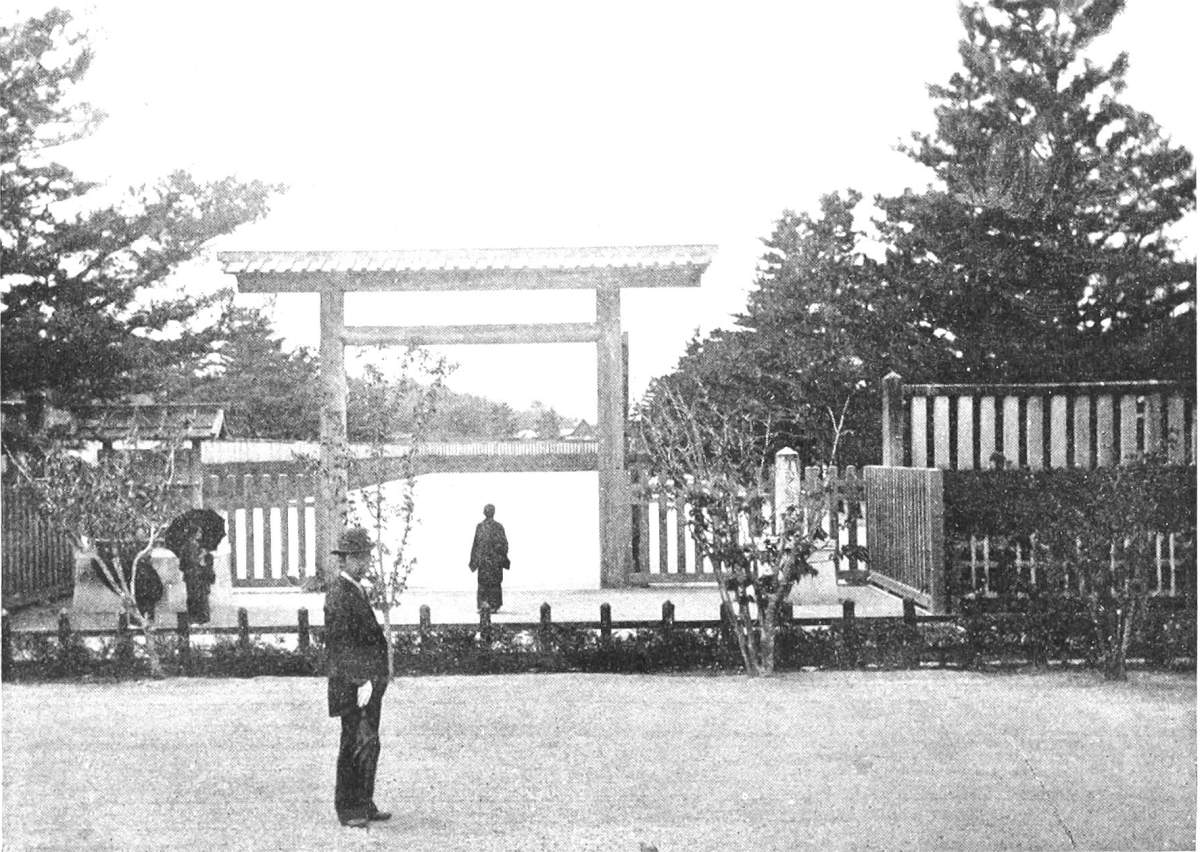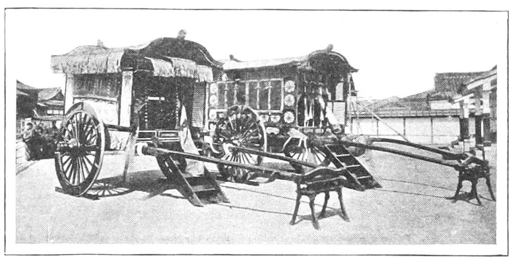 [158] According to Klaproth’s statement of Japanese legend, in his “Histoire Mythologique,” introductory to Titsingh’s “Annals of the Dairi,” the first three of the celestial gods were solitary males. The next three had female companions, yet produced their successors by the force of mutual contemplation only. The seventh pair found out the ordinary method of generation, of which the first result was the successive production of eight islands, those of Japan (the number eight being selected simply because it is esteemed the most perfect), after which they gave birth also to mountains, rivers, plants, and trees. To provide a ruler and governor for these creations, they next produced Tenshō daijin, or, in Japanese (for Tenshō daijin is Chinese), Ama terasu-no-kami (Celestial Spirit of Sunlight); but, thinking her too beautiful for the earth, they placed her in the heavens, as they did, likewise, their second born, a daughter, also, Tsuki-no-kami, goddess of the moon. Their third child, Ebisu saburō, was made god of the sea; their fourth child, Susanoō, also a son, god of the winds and tempest. He was agreeable enough when in good humor, and at times had his eyes filled with tears, but was liable to such sudden outbreaks and caprices of temper as to render him quite unreliable. It was concluded to send him away to the regions of the north; but before going he got leave to pay a visit to his sisters in heaven. At first he had a good understanding with them, but soon committed so many outrages,—in the spring spoiling the flower borders, and in the autumn riding through the ripe corn on a wild horse,—that in disgust Tenshō daijin hid herself in a cavern, at the mouth of which she placed a great stone. Darkness forthwith settled over the heavens. The eight hundred thousand gods, in great alarm, assembled in council, when, among other expedients, one of their number, who was a famous dancer, was set to dance to music at the mouth of the cavern. Tenshō daijin, out of curiosity, moved the stone a little, to get a look at what was going on, when immediately Te chikara o-no kami (god of the strong hand) caught hold of it, rolled it away, and dragged her out, while two others stretched ropes across the mouth so that she could not get in again. Finally, the matter was compromised by clipping the claws and hair of Susanoō, after which he was sent off to the north, though not till he had killed a dragon, married a wife, and become the hero of other notable adventures. This legend makes it clear what Anjirō, the first Japanese convert, meant by speaking of the Japanese as worshippers of the sun and moon. See ante, p. 49. The annual festival of Tenshō daijin falls on the sixteenth day of the ninth month, immediately after that of Suwa, and is celebrated throughout the empire by matsuri much like that described in the text. The sixteenth, twenty-first, and twenty-sixth days of every month are likewise sacred to her, but not celebrated with any great solemnity. [Also see “Kojiki.”—Edr.]