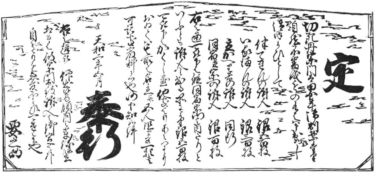 “Courtesans only, but no other women, shall be admitted. Only the ecclesiastics of the mountain Kōya shall be admitted. All other priests, and all Yamabushi, shall stand excluded.” (Note by Kämpfer. —Kōyais stated to be a mountain near Miyako, a sanctuary and asylum for criminals, no officers of justice being suffered to come there. Its inhabitants, many thousand in number, lead an ecclesiastical life. All are admitted that desire it, or who fly there for shelter, and are afterwards maintained for life, if they can but bring in thirty taels for the use of the convent, and are otherwise willing to serve the community in their several capacities. These monks are not absolutely confined to this mountain, but many travel up and down the country in what manner or business they please. Very many of them betake themselves to trade and commerce.)