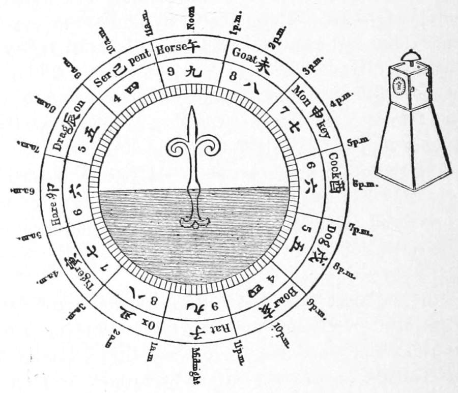 [153] The Japanese division of time is peculiar. The day, from the beginning of morning twilight to the end of evening twilight (so says Siebold, correcting former statements, which give instead sunrise and sunset), is divided into six hours, and the night, from the beginning to the end of darkness, into six other hours. Of course the length of these hours is constantly varying. Their names (according to Titsingh) are as follows: Kokonotsu [nine], noon, and midnight; Yatsu [eight], about our two o’clock; Nanatsu [seven], from four to five; Mutsu [six], end of the evening and commencement of morning twilight; Itsutsu [five], eight to nine; Yotsu [four], about ten; and then Kokonotsu again. Each of these hours is also subdivided into four parts, thus: Kokonotsu, noon or midnight; Kokonotsu-han [nine and a half], quarter past; Kokonotsu-han-sugi [past nine and a half], half past; Kokonotsu-han-sugi-maye [before past nine and a half], three quarters past; commencement of second hour: Yatsu-han, etc., and so through all the hours.