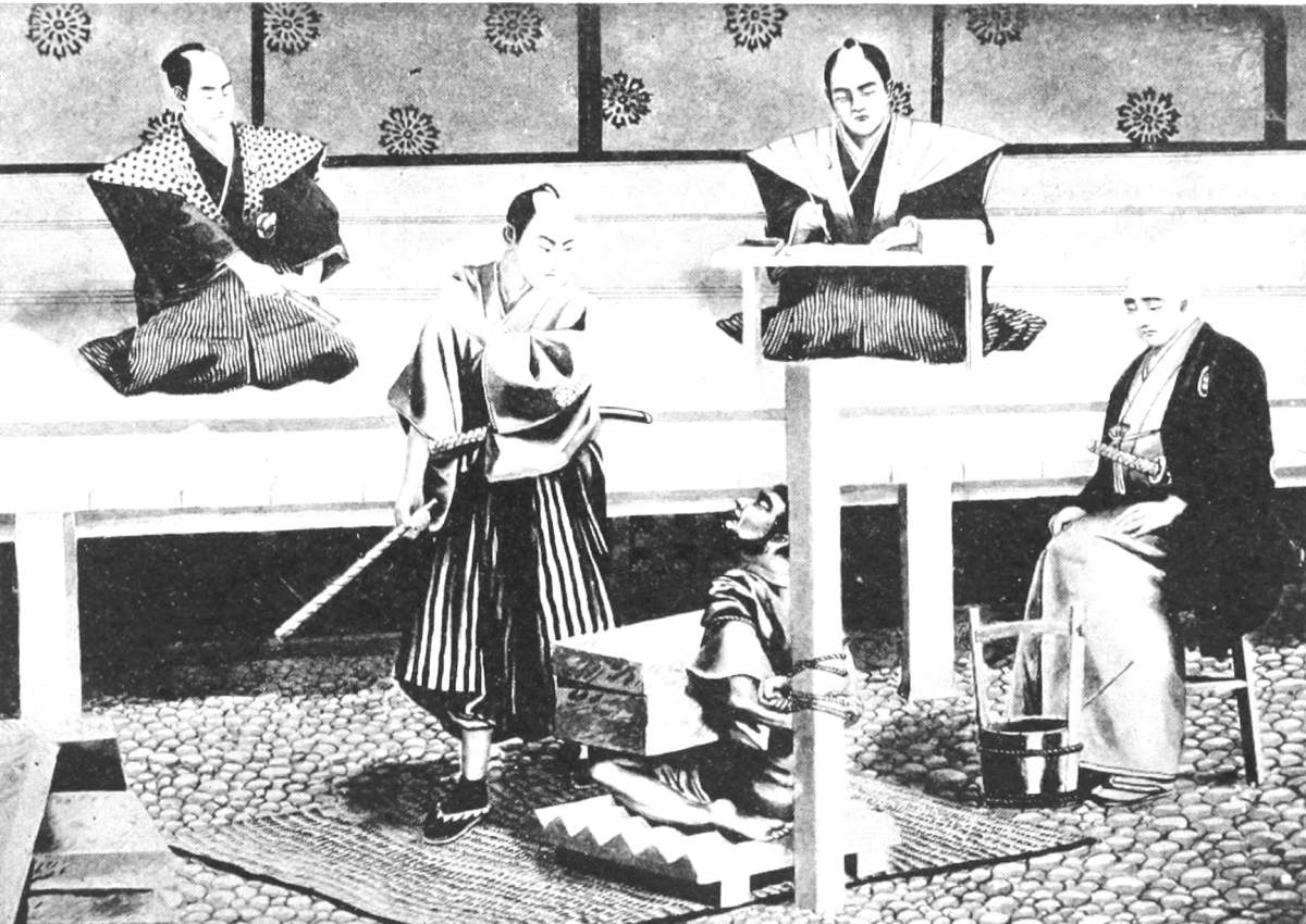 [131] The kamishimo is a state dress, composed of two garments (kami signifies what is above, and shimo what is below), a short cloak, without sleeves, called kataginu, and breeches, called hakama. Both are of a particular form (the breeches being like a petticoat sewed up between the legs), and of colored stuffs. They are used only on days of ceremony and at funerals.—Titsingh.