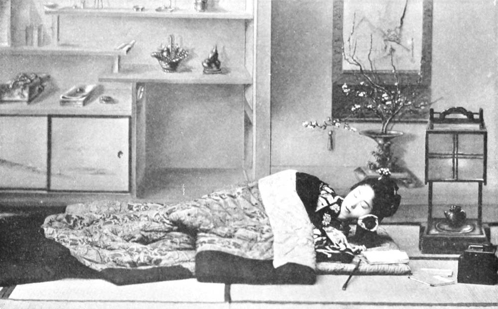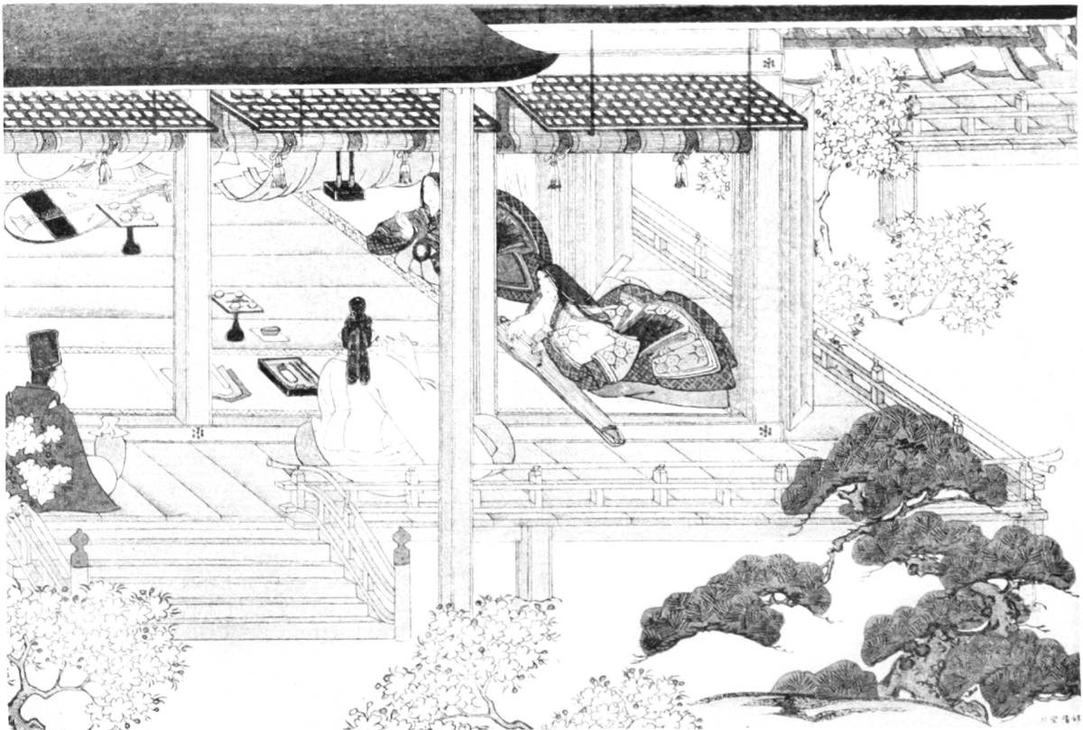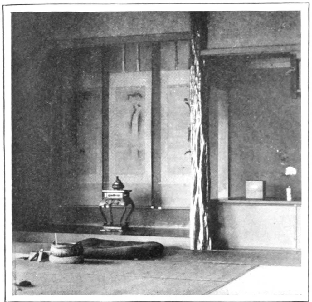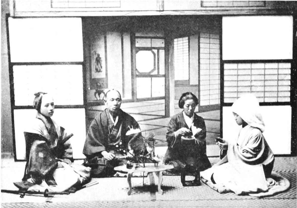 [76] The toko, as already described in Chapter XXXII, is a sort of recess, or open closet, opposite the entrance, considered the most honorable place in the room. The above ceremony might call to mind the confarratio of the ancient Roman marriage.