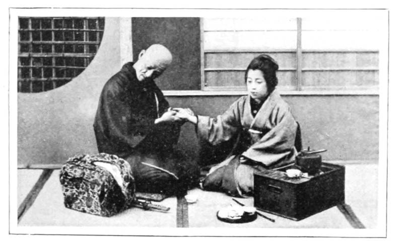 [101] Yet Kahei wore two swords, though perhaps he did it in the character of a ship-master, or as an officer in authority in the island to which he traded from Hakodate, carrying on the fishery there chiefly by means of native Kuriles. These islands appear to have been farmed out by the government to certain mercantile firms, which thus acquire a certain civil authority over the inhabitants. The privilege of wearing swords, like other similar privileges elsewhere, is probably rather encroached upon by the unprivileged. On festival days, even the poorest inhabitants of Nagasaki decked themselves out, according to Kämpfer, with at least one sword. The present of a sword as a marriage gift—and it is ceremonies practised among the mercantile class, to which reference is made—is mentioned on p. 181.