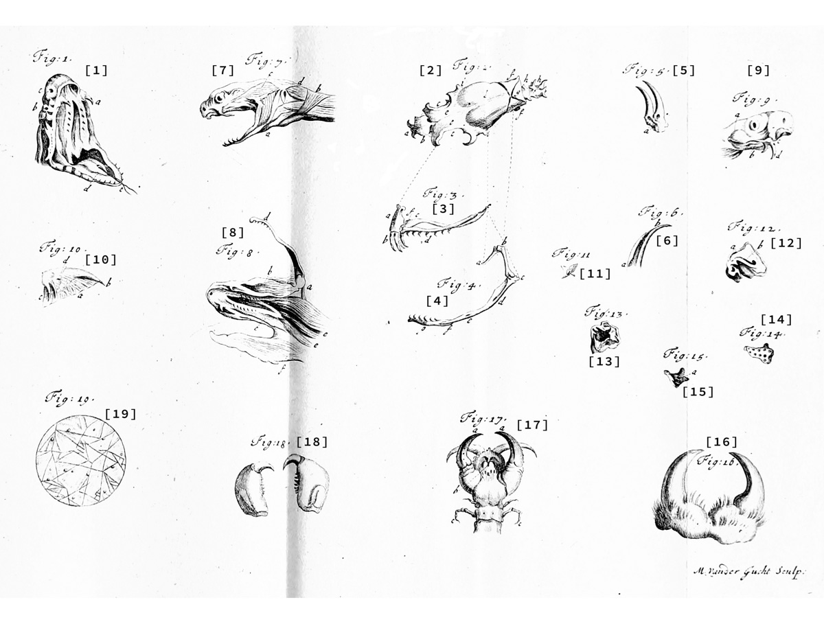 The Upper Jaw (Fig. 3.) is, besides the Teeth, composed on each side of three Bones. The First (a), into which the Poisonous Fangs are fixt, is articulated with the Anterior Protuberance of the Orbit of the Eye; and has a Motion of Flexion and Extension, that is, forwards and backwards, by which the Fangs are Erected or Depress’d. It is small at the Joint, but grows broader by degrees, to a pretty large Basis, the better to contain a considerable Number of Teeth. It is Spongy like the Substance of the Vertebræ, and no ways fit to be the immediate Organ of Hearing, as Mr. Charas and some others have imagined.
