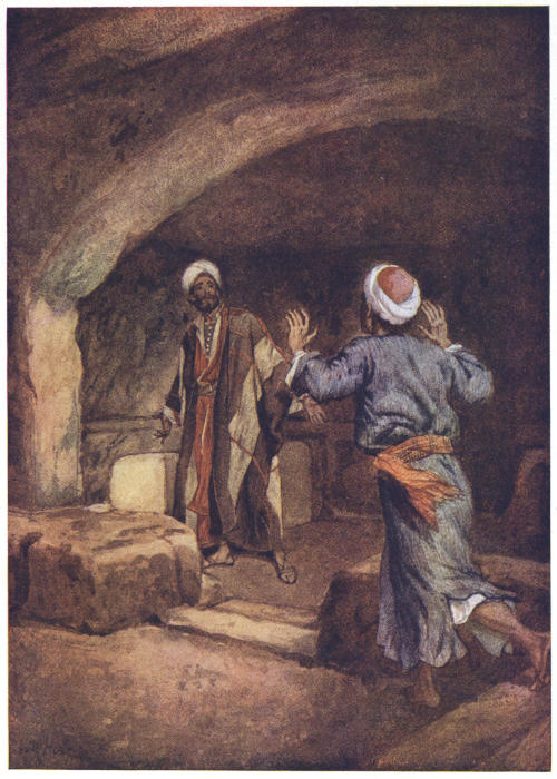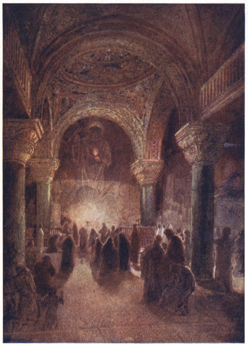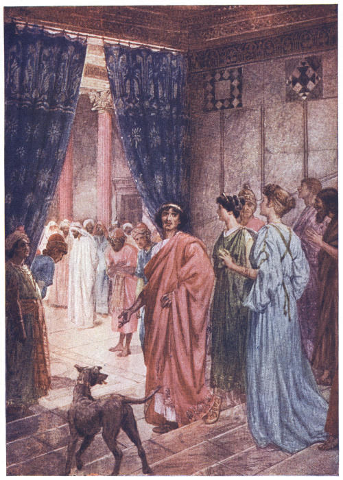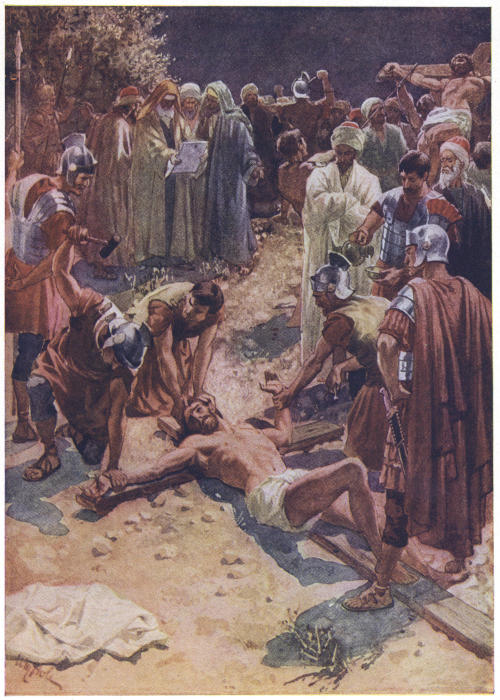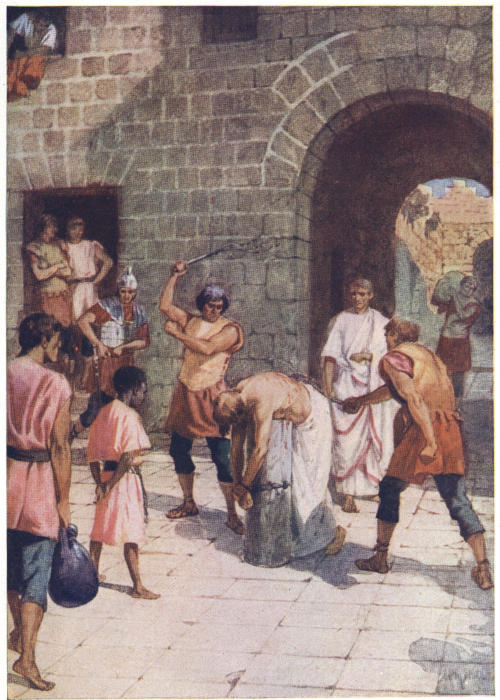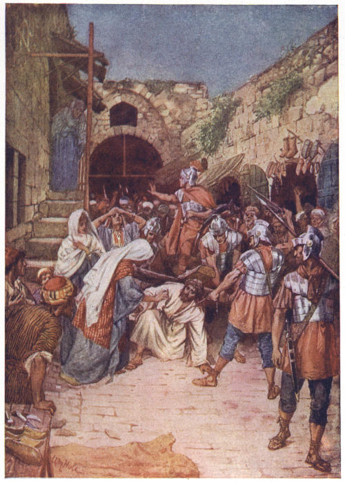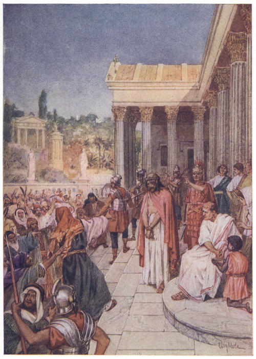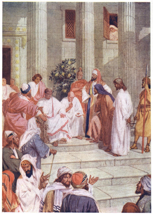 Priding themselves upon their strict administration of justice, the Romans not infrequently erected their tribunals in the open air, by the city gate, in the market-place or theatre, or even at the roadside, in order that all might have the opportunity of seeing and hearing. The design of Herod’s magnificent palace, now the official residence of Pilate, evidently made permanent provision for this method of official procedure, the “Gabbatha”—a platform—being a tesselated pavement in front of the Judgment Hall, to which access was obtained by a flight of steps. In the centre of this pavement was a slightly-raised platform, upon which was placed the curule chair of the procurator, with seats to right and left for the assessors; other officers of the court occupying benches on the lower level.