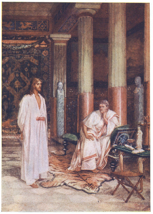 Then Pilate entered into the judgment hall again, and called Jesus, and said unto him, Art thou the King of the Jews? Jesus answered him, Sayest thou this thing of thyself, or did others tell it thee of me? Pilate answered, Am I a Jew? Thine own nation and the chief priests have delivered thee unto me: what hast thou done? Jesus answered, My kingdom is not of this world: if my kingdom were of this world, then would my servants fight, that I should not be delivered to the Jews: but now is my kingdom not from hence. Pilate therefore said unto him, Art thou a king then? Jesus answered, Thou sayest that I am a king. To this end was I born, and for this cause came I into the world, that I should bear witness unto the truth. Every one that is of the truth heareth my voice. Pilate saith unto him, What is truth?—St. John xviii: 33-38.