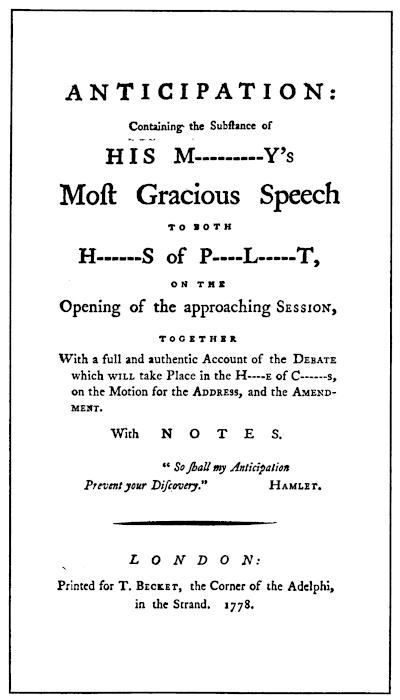 Anticipation: Containing the Substance of His M⸺y’s Most Gracious Speech to both H⸺s of P⸺l⸺t, on the Opening of the approaching Session, together With a full and authentic Account of the Debate which will take Place in the H⸺e of C⸺s, on the Motion for the Address, and the Amendment. With Notes. “So shall my Anticipation Prevent your Discovery.” Hamlet. London: Printed for T. Becket, the Corner of the Adelphi, in the Strand. 1778.