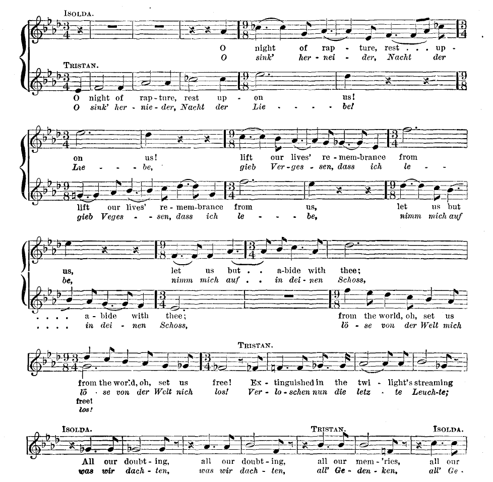 (ISOLDA sinks, as if transfigured, in BRANGÆNA'S arms upon TRISTAN'S body. Profound emotion and grief of the bystanders. MARK invokes a blessing on the dead. Curtain.)