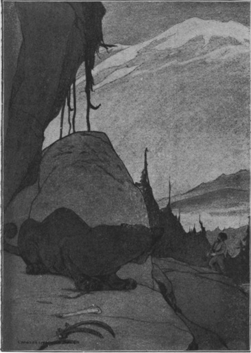 And the man moves on unconscious of any lurking danger. As he passes, the spell of his presence passes also. A roar comes from the depths of the cavern, and is answered by the wolves as they crowd up to the edge of the plateau. But though their reply is bold they hesitate to advance further. For they know who dwells where the broken, bleaching bones lie, and fear is in their hearts. They snuff at the air with muzzles up-thrown, and their mangy coats bristle with sullen anger. The crowd increases, the courage of the coward begins to rise within them. A fierce argument arises, and the debate takes the form of a vicious clipping of huge fangs. A mighty roar interrupts them, seeming to quell their warlike spirit. For a moment silence reigns.