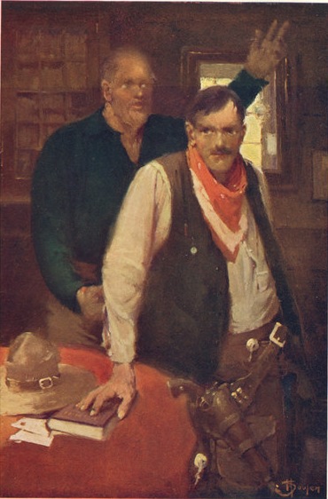 The ranch owner was sitting on the side of the stretcher, and Jim Thorpe, his foreman, stood leaning against the table. McLagan’s Irish face, his squat figure and powerful head were a combination suggesting tremendous energy and determination, rather than any great mental power, and in this he strongly contrasted with the refined, thoughtful face of his foreman.