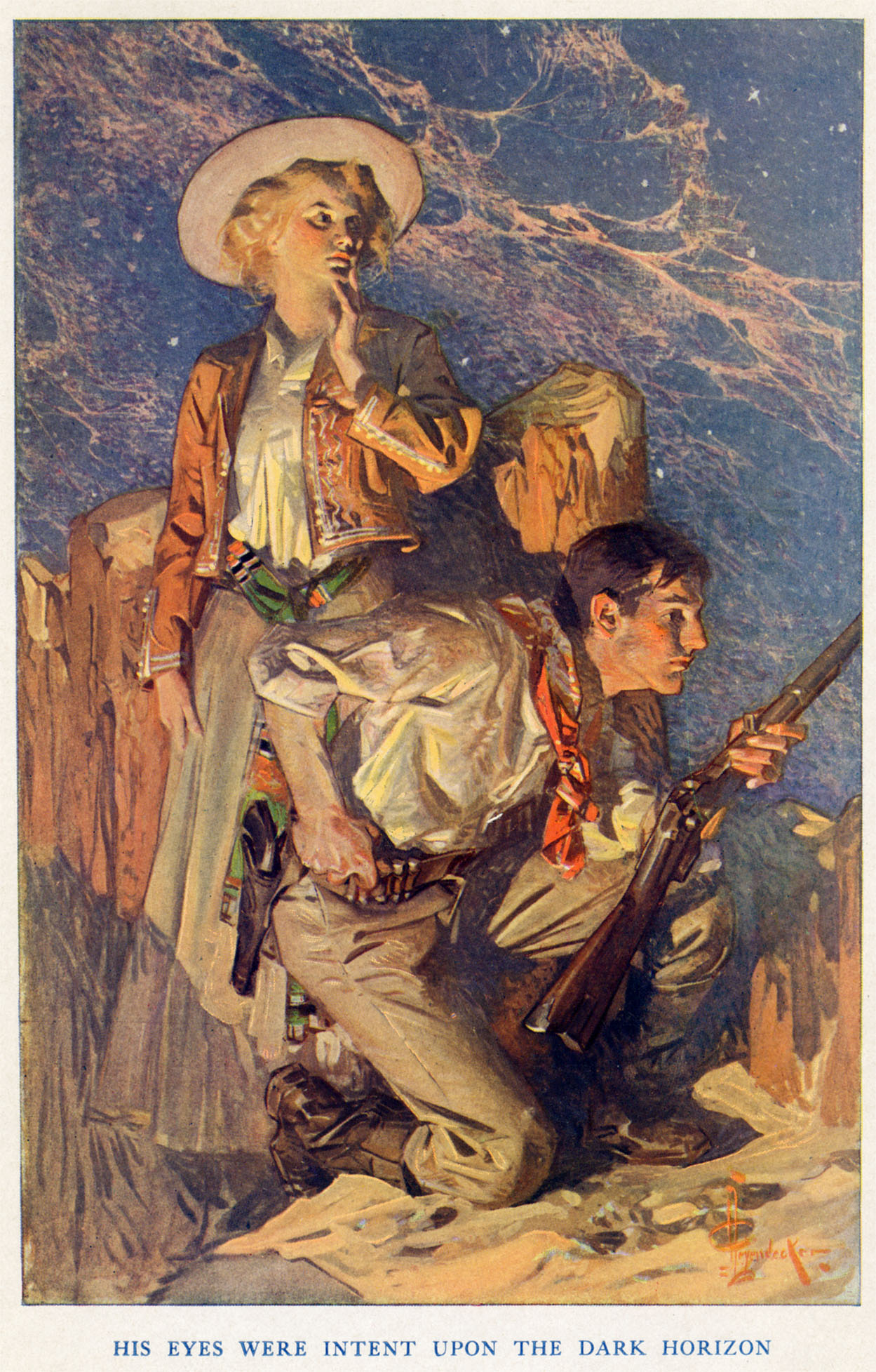 The man understood his wife’s strong character, and her reply made him feel as though his responsibilities had been suddenly increased. He looked at his companions riding in scout fashion in front. They were pointing at something on the horizon, and he followed the direction indicated.