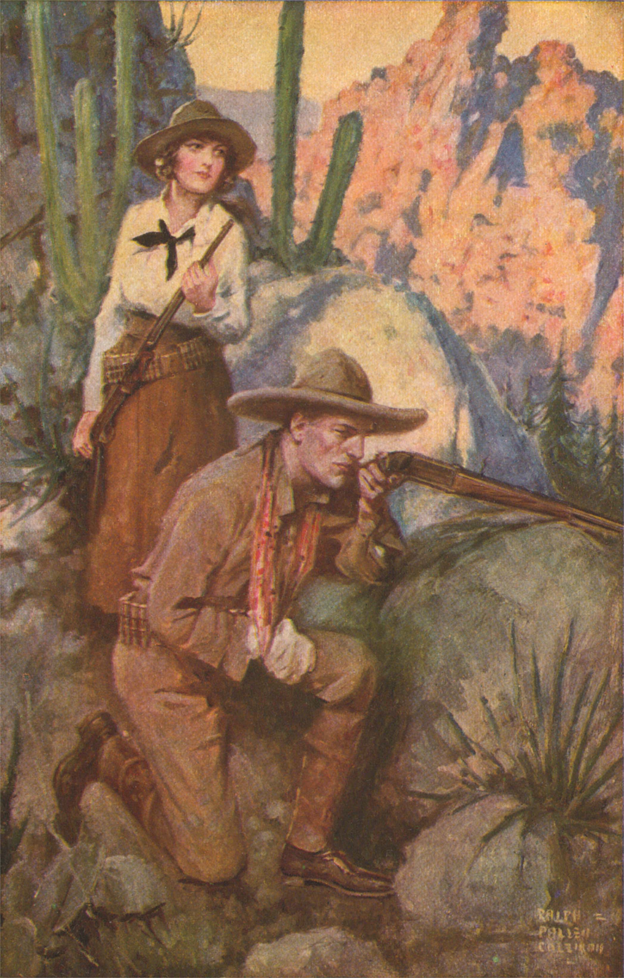 From down across the arroyo came a sharp clatter of hoofs. He whirled, with his rifle at his shoulder. Over the barrel he saw a scraggy pony loping down into the wash along the trail of the burro. The pony's rider was armed with a rifle. Lennon took quick aim—only to drop the muzzle of his weapon. The rider had flung up a gauntleted hand, palm outward. A musical feminine hail rang aslant the arroyo: