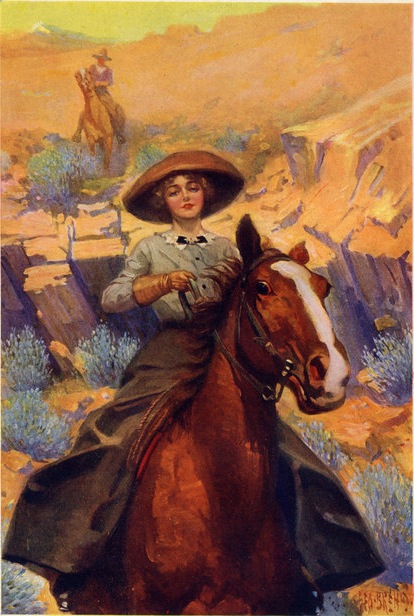 “Yes, but he may have been after a deer,” answered the girl, lifting her lithe figure tiptoe in the stirrups of her man’s saddle to peer over the bushes. 10