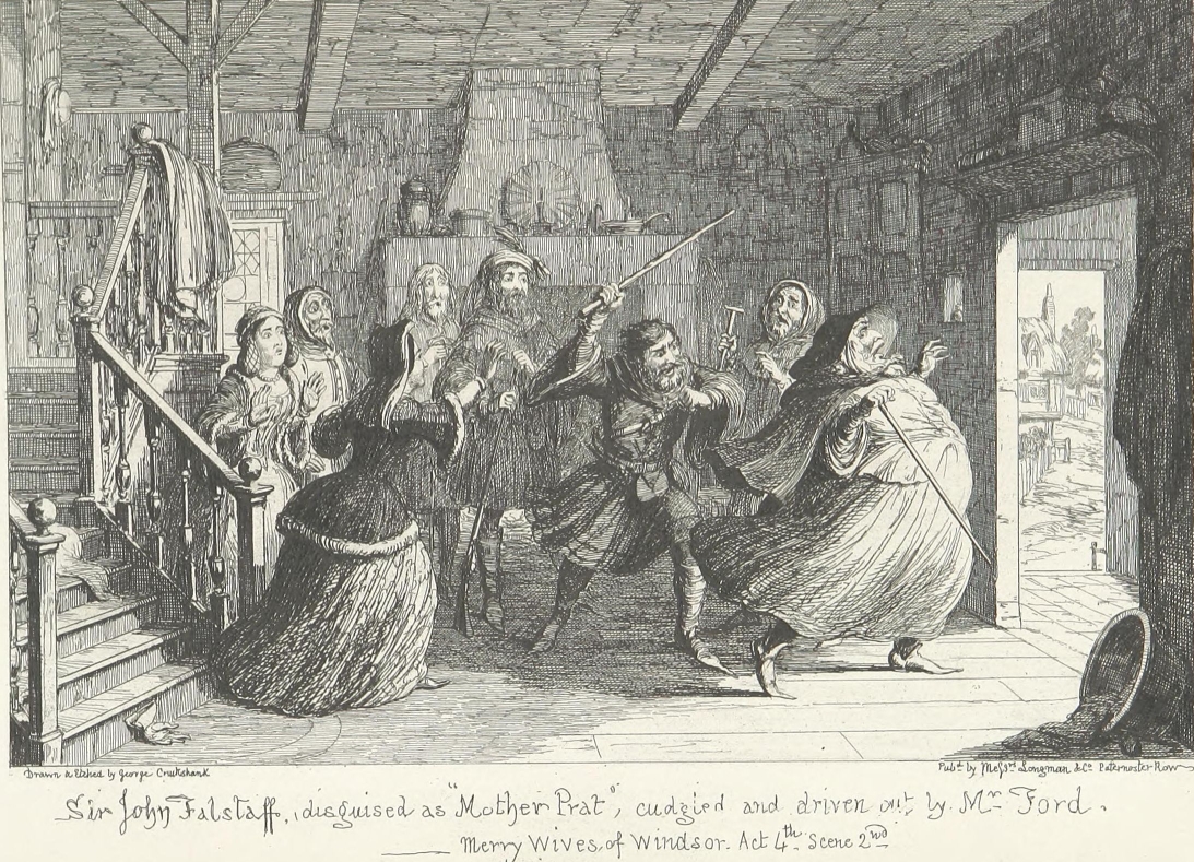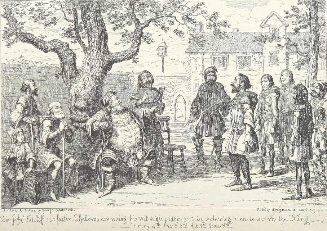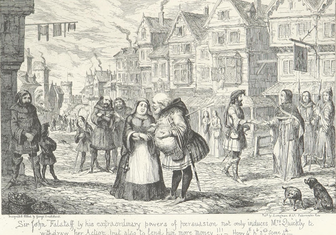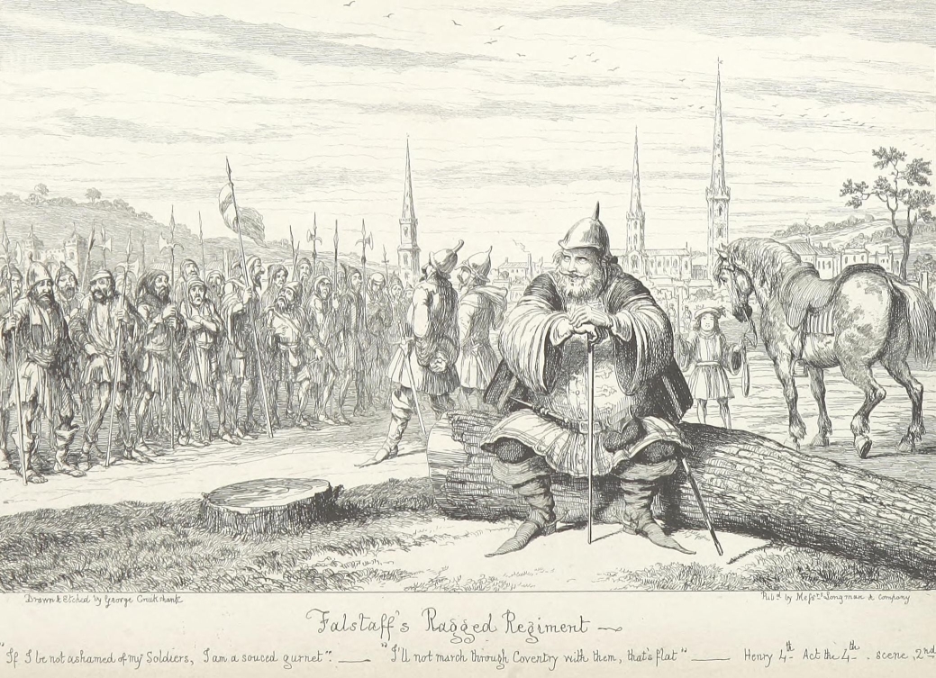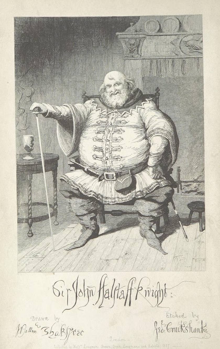It is possible that Sir John Falstaff’s muddy boots, drenched doublet, three days’ linen and all, might have been tolerated on the score of gentle birth and past services. But there was no getting over the bodily presence of Bardolph, Pistol, and a dilapidated, draggle-tailed country justice from the wilds of Gloucestershire.