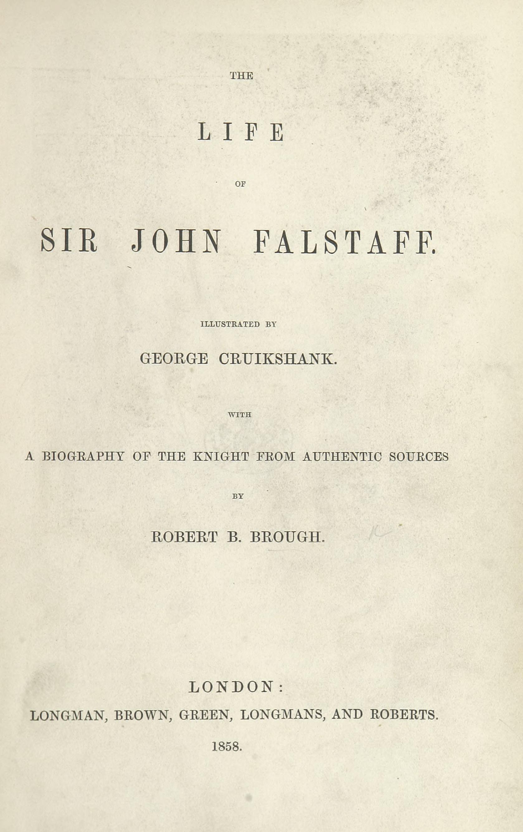 Reader! think not that we are going to trouble you to hunt with us. Deem not that we should have presumed to appear before you till we had found the needle, and cleared it from the last hayseed. Like Mohammed, of the Arabian desert,—or Mr. Albert Smith, of the Egyptian Hall,—we have been to the mountain; and, imitating the more modern popular leader, appear before you, wand in hand, ready to describe the particulars of our ascent, with illustrations. The amplest materials for the Life of Sir John Falstaff are in our possession—from his birth, even to the date of that morning when, at three of the clock, a small white head (we reject the accompanying phenomena) made its first appearance in the world; to his boyhood,—where the moving panorama will pause awhile, at the court gate, to show you Thomas Mowbray’s page breaking Skogan’s head, on that doubly memorable day that also witnessed an encounter between Master William Shallow and Sampson Stockfish, a fruiterer; on, past his summer of manhood, to his glorious autumn, when our knight reaped sheaves of golden renown at Gadshill and at Shrewsbury; to that second Indian summer, when Sir John Falstaff, round and glorious as the harvest moon, could still attract the gilding rays of sunny Mistress Page’s view; down to that cold winter night, between twelve and one—e’en at the turning of the tide!—when those fingers that of old had grasped the hilt and managed the target, fumbled with the sheets and played with flowers—when that voice that had been the mouthpiece of Wit itself, the igniting spark of wit in others, could only babble of green fields—till Sir John Falstaff’s feet grew cold as any stone, and so upward and upward till all was as cold as any stone, even as that which careless, laughing workmen fell to hewing and chipping on the following day!