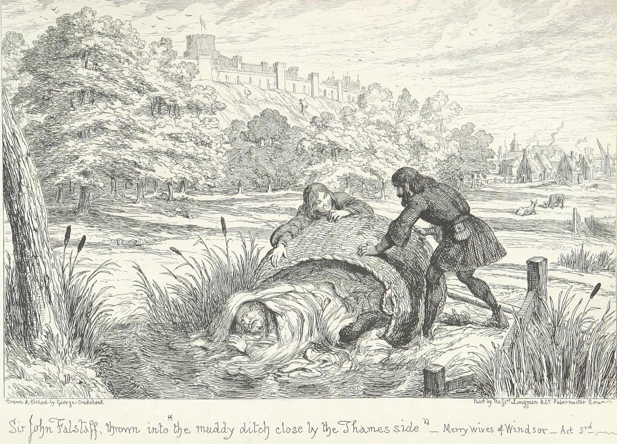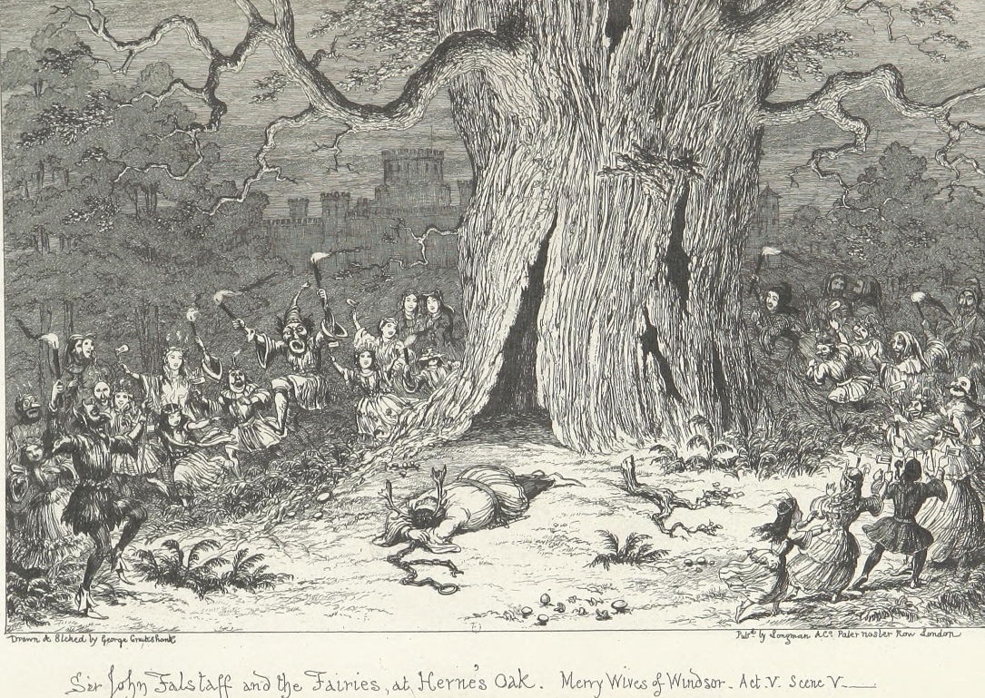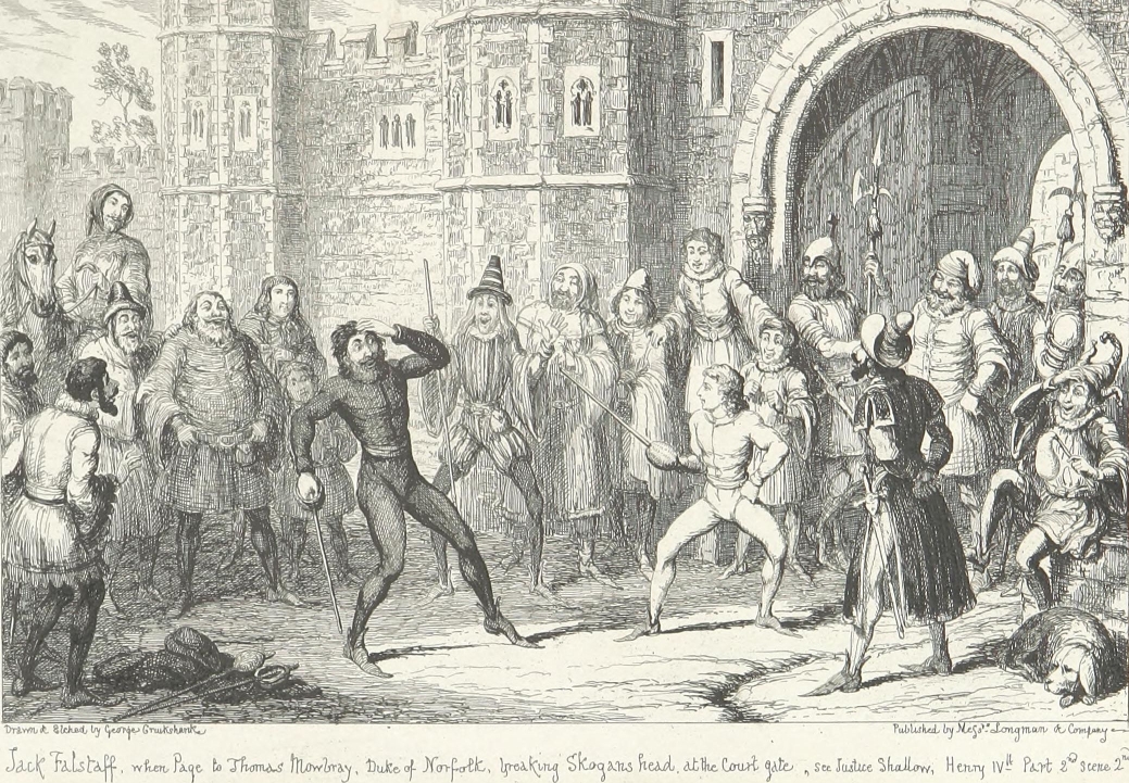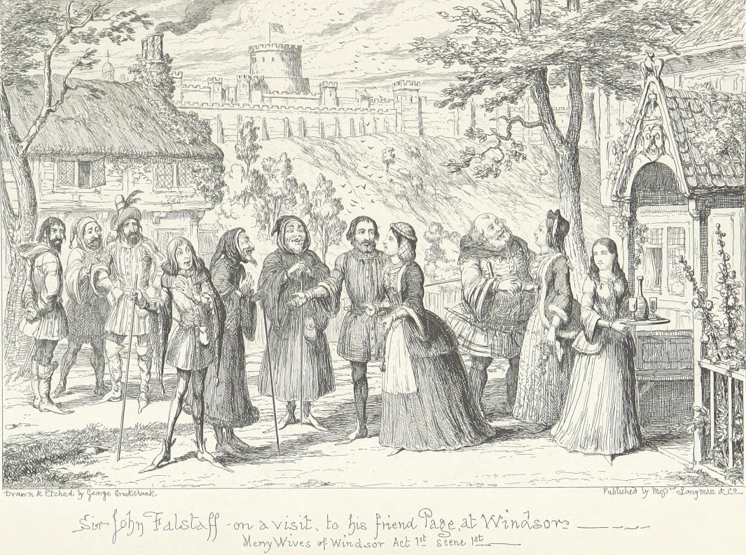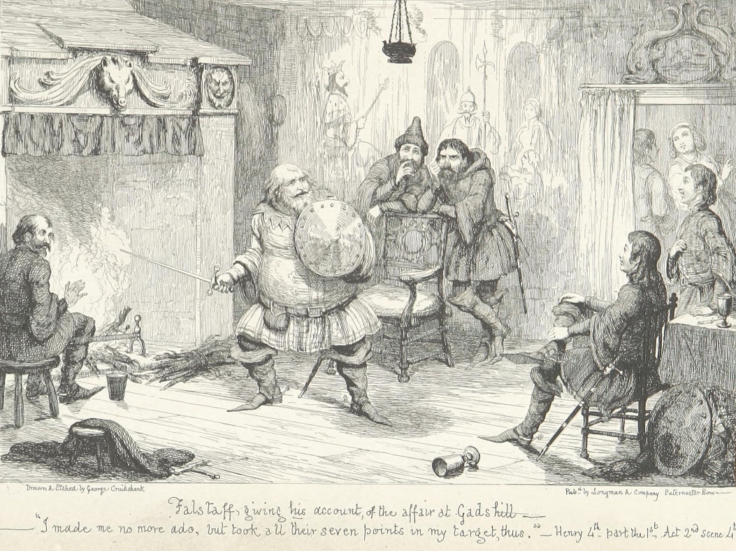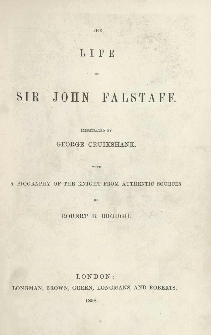But should the Biographer recoil before this merely negative obstacle of barrenness, at the outset of his researches—as though a traveller, with his mountain goal in sight, should sit down and despair because he sees the plain beneath obscured by intervening mists? Has not the difficulty of finding a needle in a bottle of hay (which, by the way, has always appeared to us a remarkable article to be kept in bottle) been greatly exaggerated? All you have to do, is to make sure that the needle is really in the bottle. Patience and a microscope will lead you to its discovery. It may be stated that between Sir John Falstaff and a needle there is not much resemblance, and that an allusion to anything microscopic in his case is inappropriate. We merely anticipate the objection that we may pass it over. The fact that our knight lived to the age of threescore odd is a proof (by induction) that he must have been born somewhere, and at a date anticipatory by some sixty odd years of that of his death. That he had the usual number of parents is at least probable. That he had received a good education, for his time, we have ample proof. These are great data to go upon. The needle is in the bottle. All we have to do, is to separate carefully the musty hay of antiquity, aided by the glass of investigation; to plunge boldly into the mists of contradictory evidence, and push our way patiently till we get to the mountain,—which, with the full length and breadth of Mr. George Cruikshank’s faithful historical portrait on our opening page before us, is perhaps a better image than the needle.