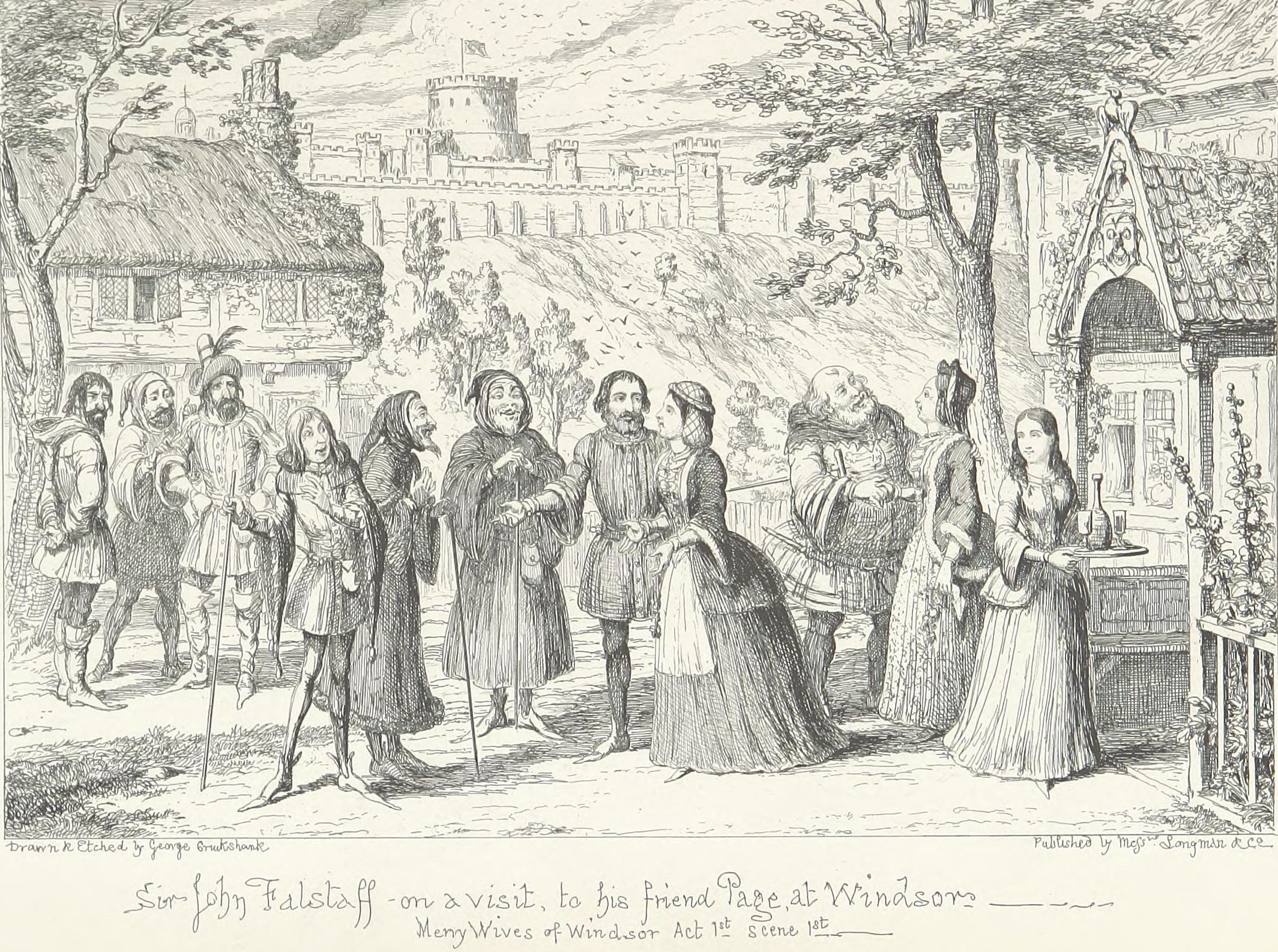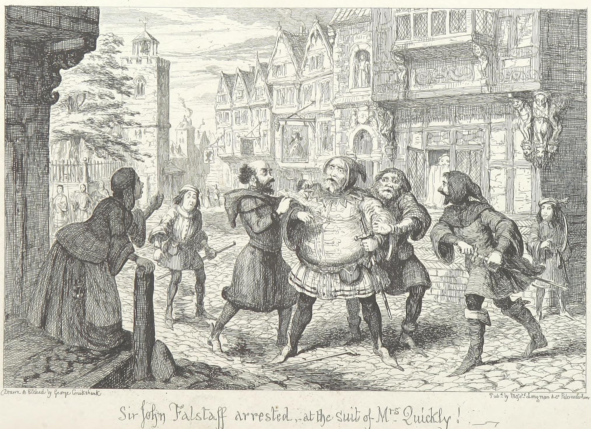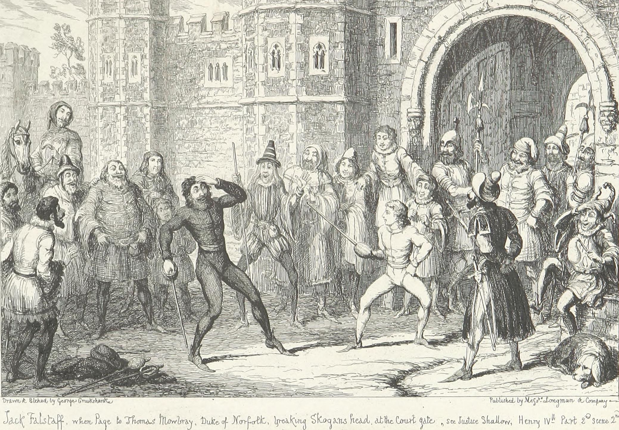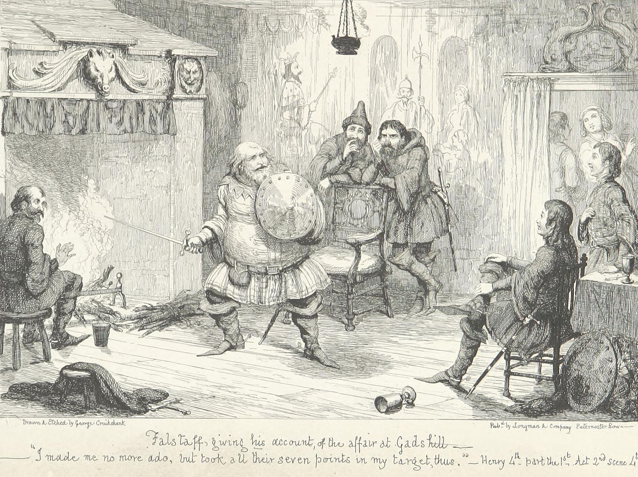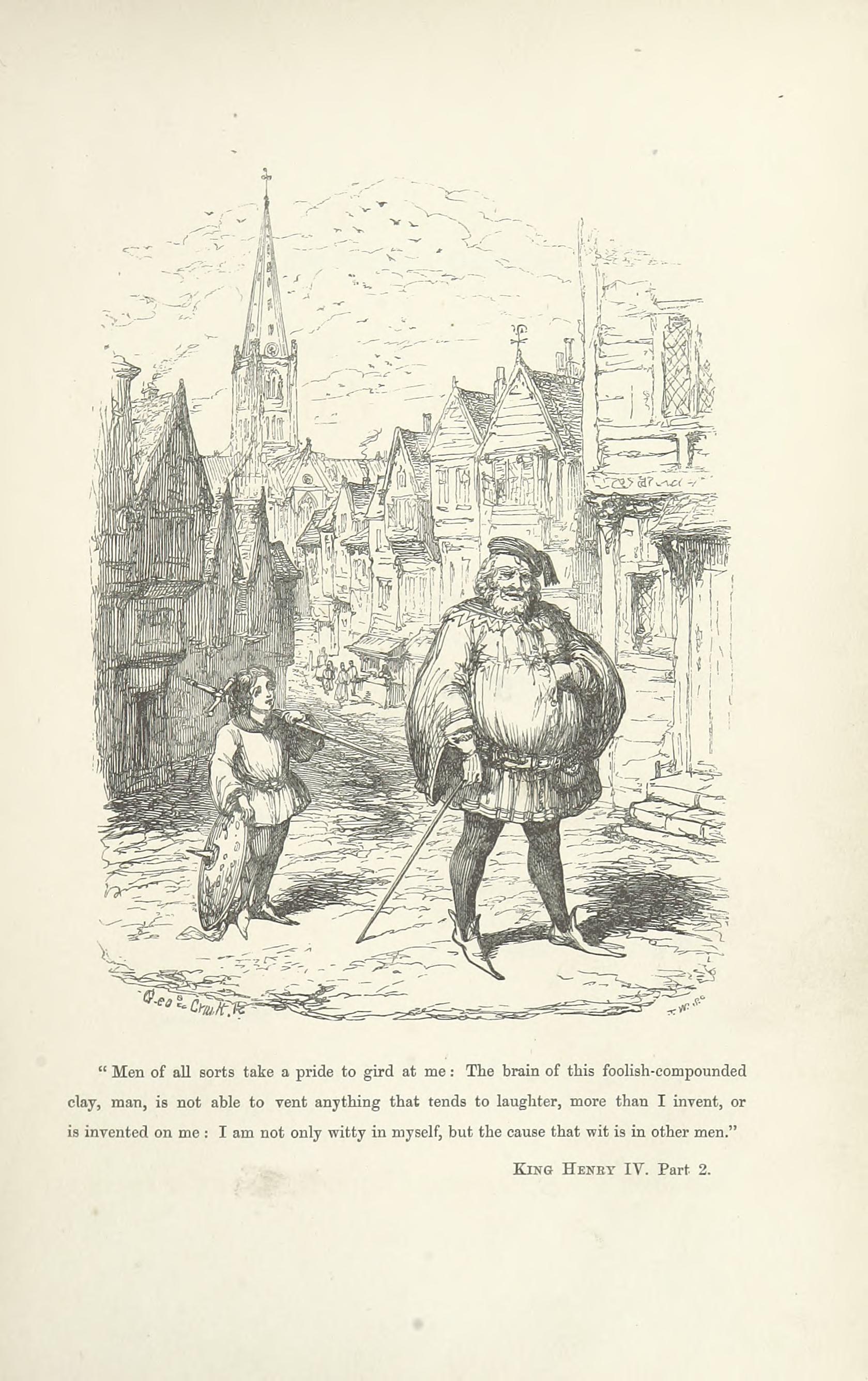 This design Mr. George Cruikshank has carried out in a series of etchings which forms the essential part of the volume now offered to the public,—with what success, it would not become the present writer—his friend and colleague—to dilate upon. It may be stated, fairly, that no pains have been spared by the artist to make his work conscientiously complete. Every locality indicated by the poet has been carefully studied either from personal observation or reference to the most authentic records—(take, for example, the views of Shrewsbury and Coventry as they appeared in the fifteenth century and the tall spire of “Paul’s” before it was struck by lightning). The costumes, weapons, furniture, &c., are from the best available authorities. Had Sir John Falstaff really lived (as it must remain a matter of impossibility to persuade the majority of mankind he did not), and gone through the various experiences imagined for him by Shakspeare, it may be very safely assumed that an eye-witness of all or any of them would have observed a series of scenes very closely resembling the designs which accompany these pages.
