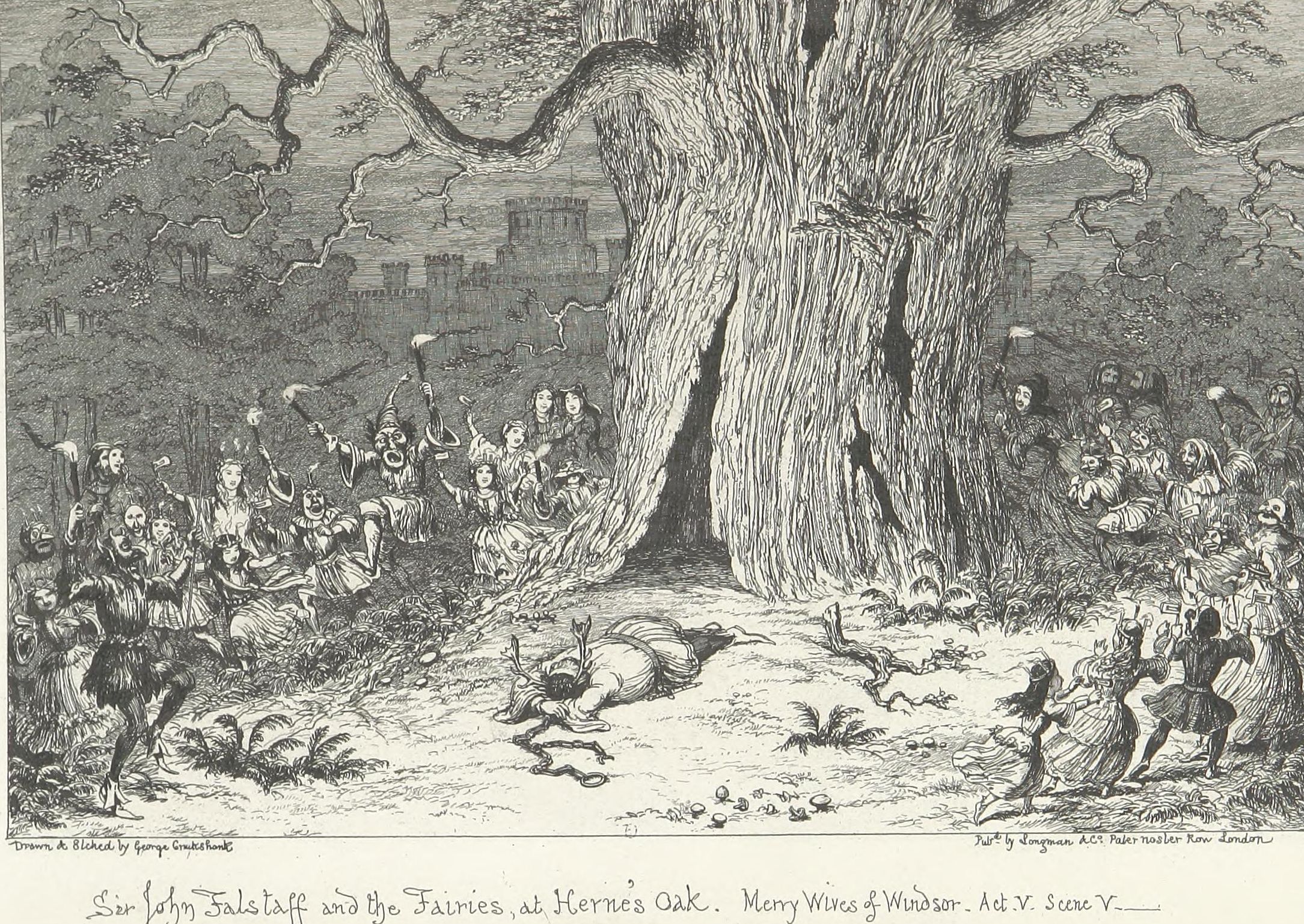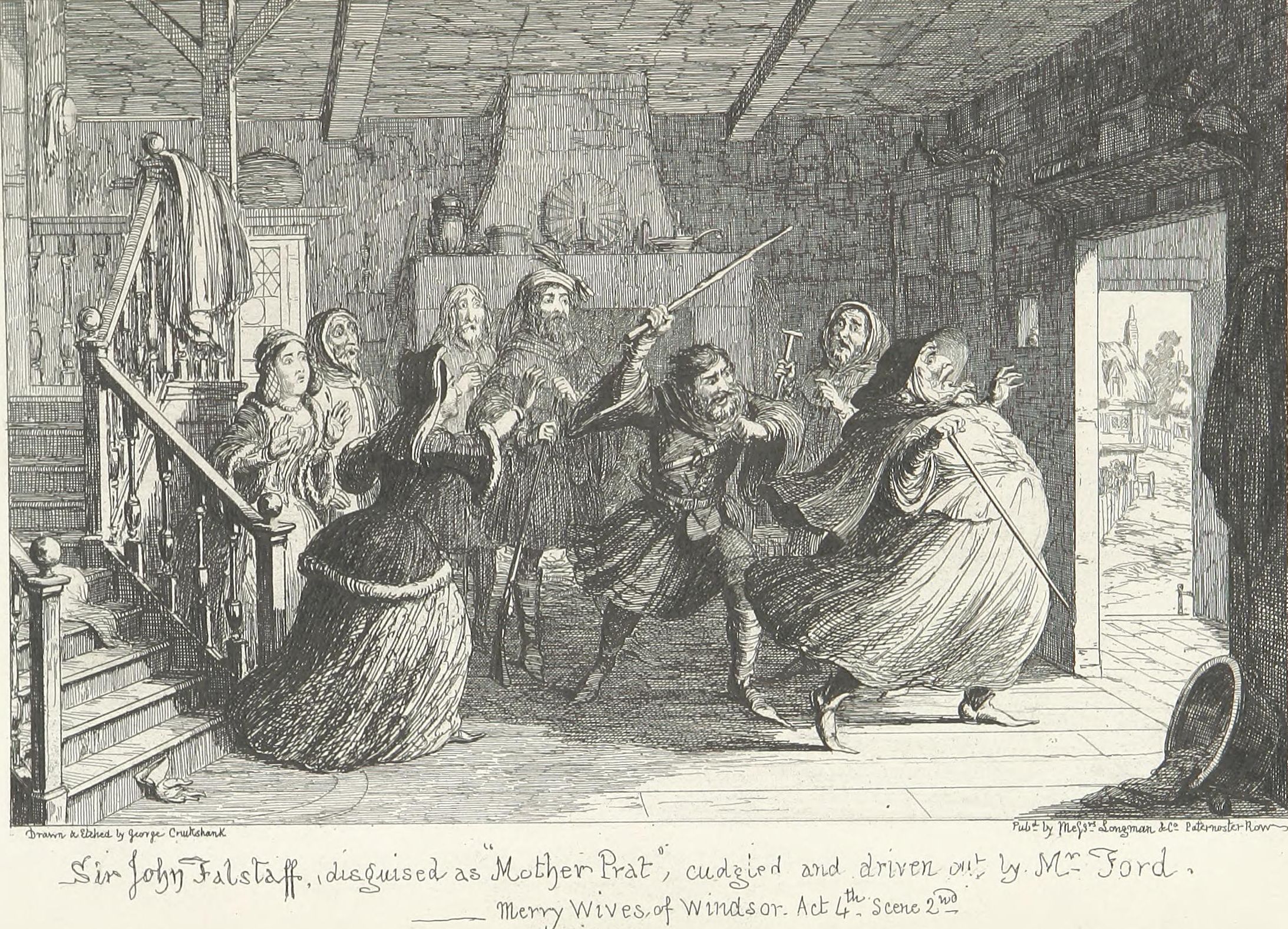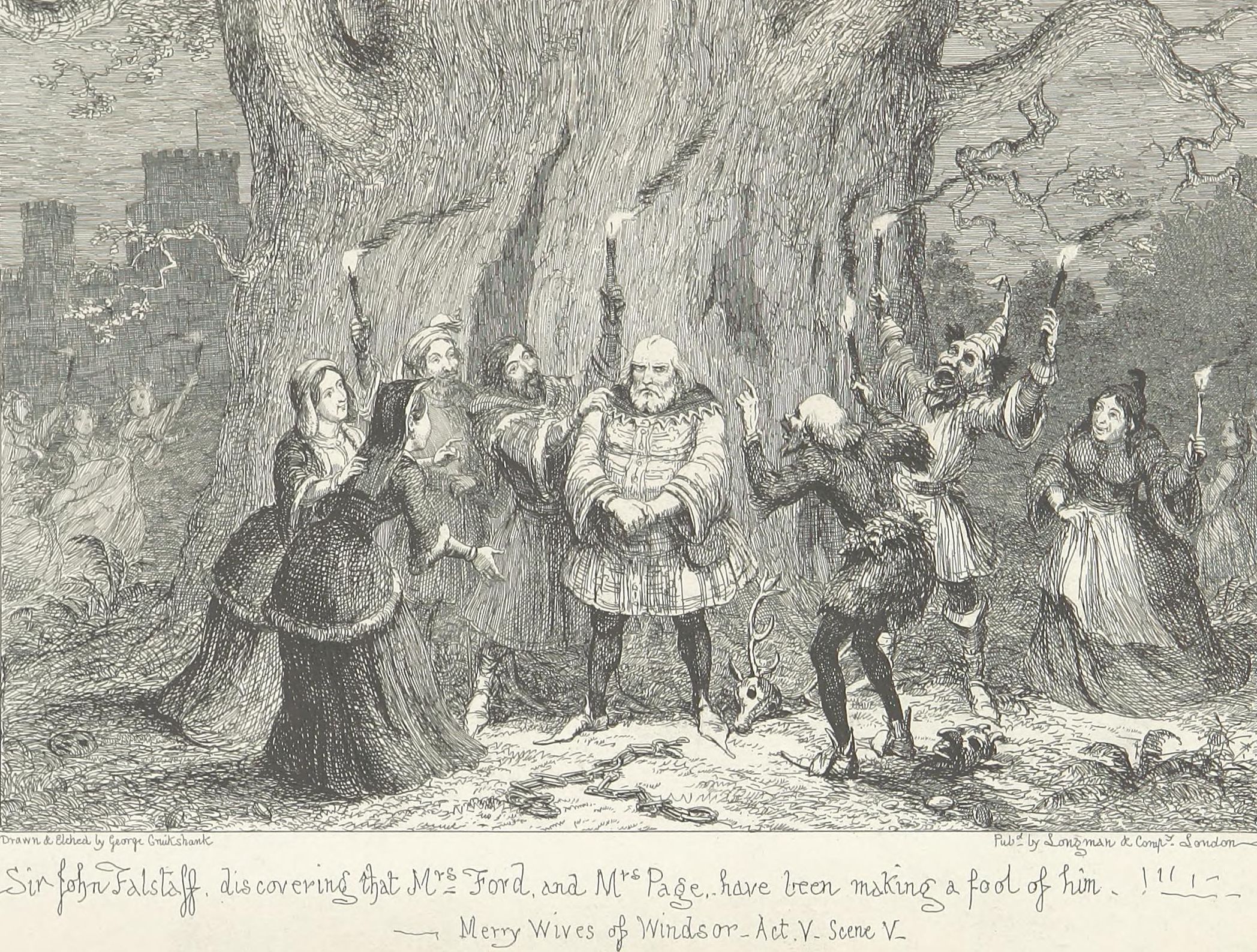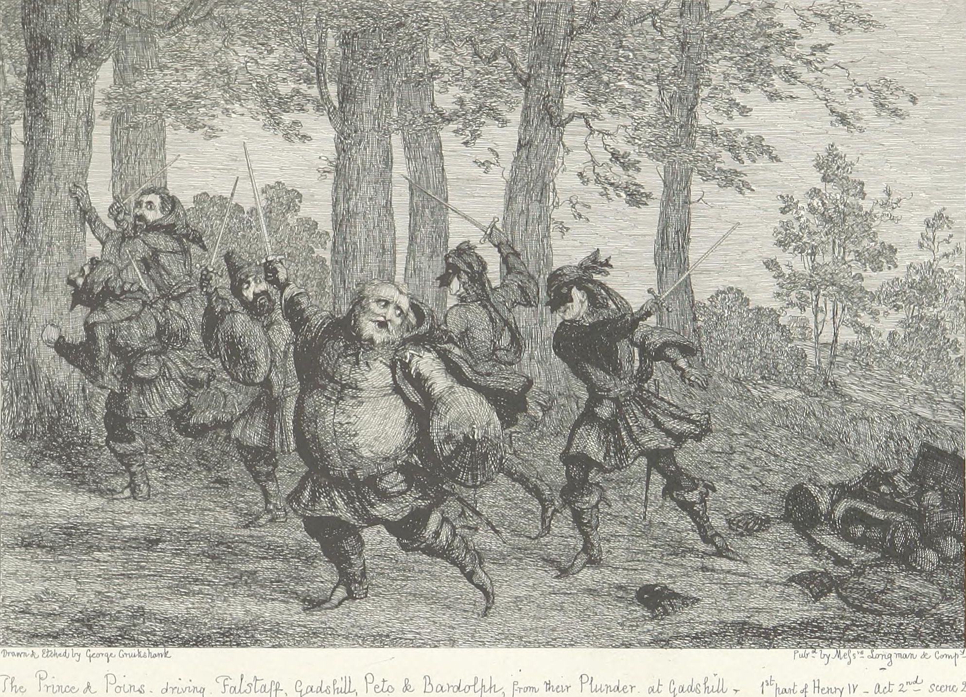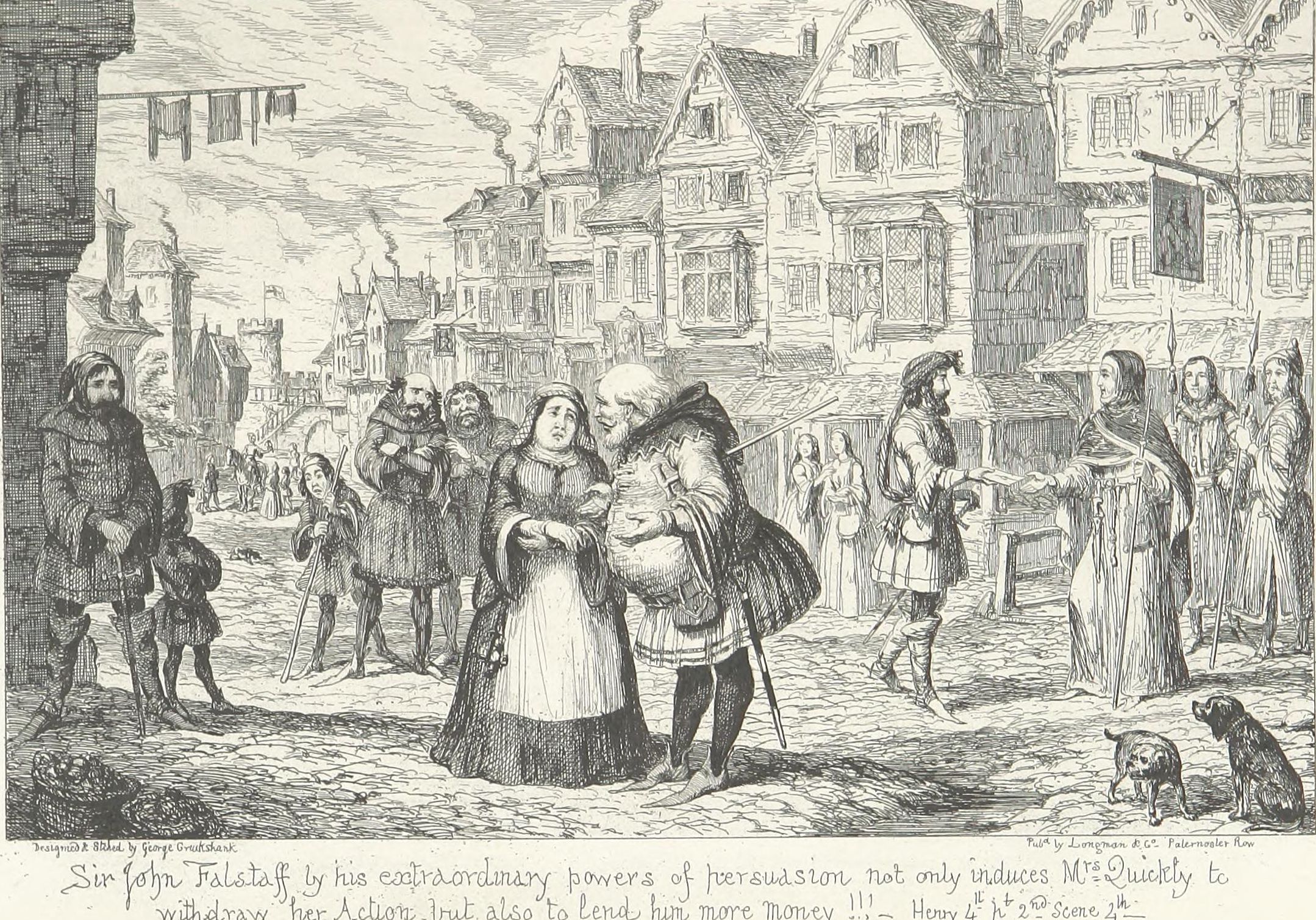 This design Mr. George Cruikshank has carried out in a series of etchings which forms the essential part of the volume now offered to the public,—with what success, it would not become the present writer—his friend and colleague—to dilate upon. It may be stated, fairly, that no pains have been spared by the artist to make his work conscientiously complete. Every locality indicated by the poet has been carefully studied either from personal observation or reference to the most authentic records—(take, for example, the views of Shrewsbury and Coventry as they appeared in the fifteenth century and the tall spire of “Paul’s” before it was struck by lightning). The costumes, weapons, furniture, &c., are from the best available authorities. Had Sir John Falstaff really lived (as it must remain a matter of impossibility to persuade the majority of mankind he did not), and gone through the various experiences imagined for him by Shakspeare, it may be very safely assumed that an eye-witness of all or any of them would have observed a series of scenes very closely resembling the designs which accompany these pages.
