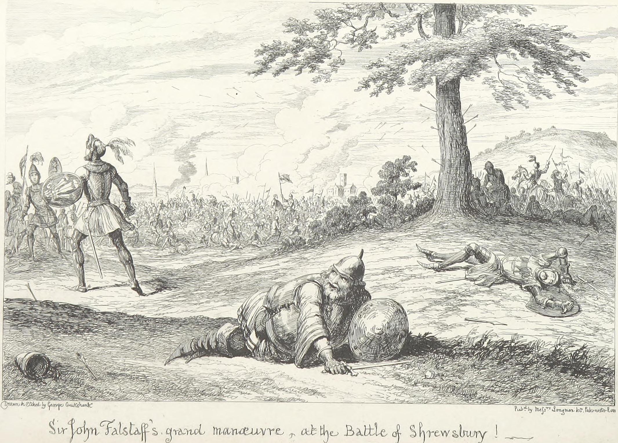 It was a natural thought, then, for a modern humorist,—using the pencil and etching point as his means of expression,—a man whose competence to appreciate and illustrate the arch-humorist, Shakspeare, will scarcely be disputed—to propose to himself a series of pictures embodying the most prominent events in the imaginary career of Shakspeare’s most humorous character—in which the illusion intended by the dramatist should be carried out by an attention to chronological and archaeological probability of detail, in a pictorial sense, corresponding to the marvellous fidelity of historic local colour, which, surrounding the movements of Sir John Falstaff in the Shakspearian dramas, will continue (in spite of all material proof whatever) to bring the veracious records of English history during the fifteenth century into disrepute and suspicion—from the fact of their omitting all mention of Sir John Falstaff’s name and achievements.