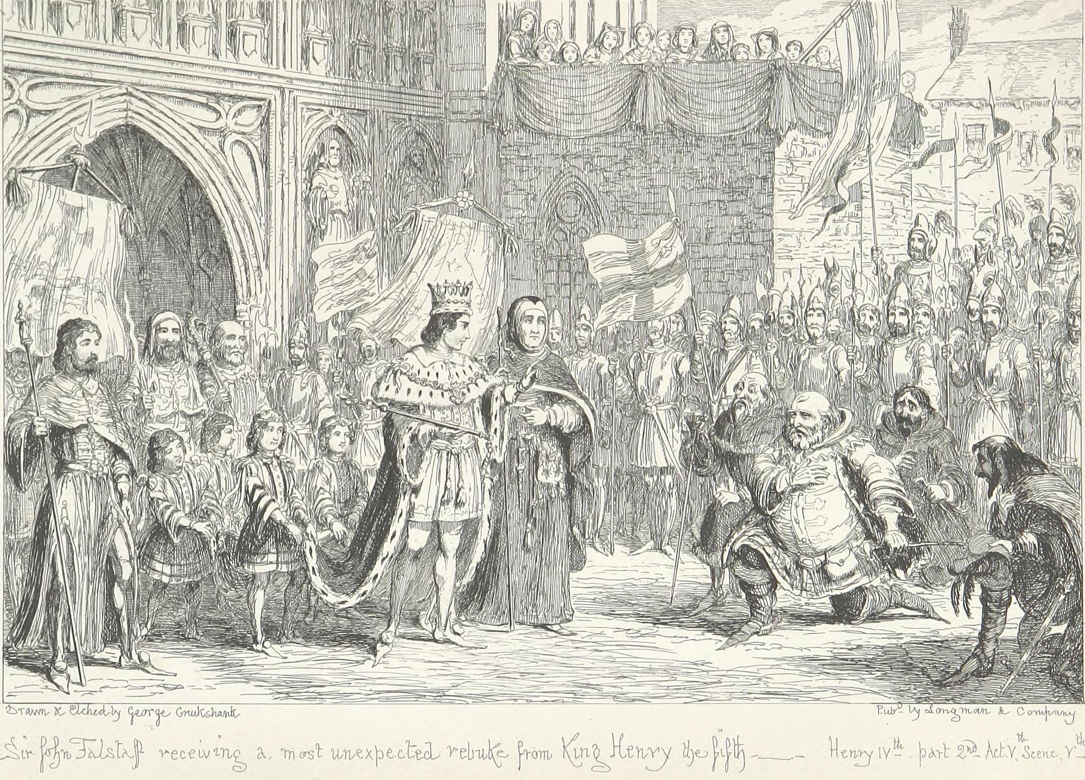 And then King Henry the Fifth, with his crown on, followed by his brothers, cousins, nobles, ambassadors, clergy, mace-bearers, sword-bearers, pages, retainers, and what not—by no means forgetting James the First, poet and King of Scotland (who, I am sure, cast a glance of sympathy at the paralysed figure of Sir John Falstaff, kneeling aghast and open-mouthed among the damp rushes of the courtyard), and Master John Lydgate, the laureate monk of Bury (who also, I am willing to believe, was rather distressed at the turn things had unfortunately taken)—took the arm of the triumphant Lord Chief Justice Gascoigne, and proceeded to dinner in the hall of Richard the Second, as though such a person as John Falstaff had never had existence. .